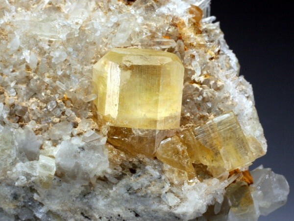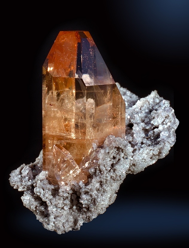另有一些託帕石,形成於流紋岩的孔洞或者縫隙之中,這種形成於強酸性噴出巖(流紋岩岩漿Si 元素含量高,酸性強)環境中的託帕石,往往晶體較小,形態獨立,晶面平滑而有光澤,礦物共生組合關係相對簡單。流紋岩型託帕石標本的著名產地有兩個:一個是美國猶他州賈布郡(Jaub Country)的托馬斯山脈,也就是文章的第一和第三張圖片。而第二個產地,是來自墨西哥聖路易斯波託西州西南部的礦山。