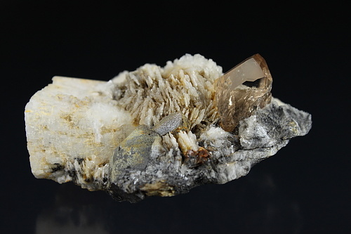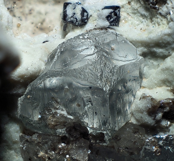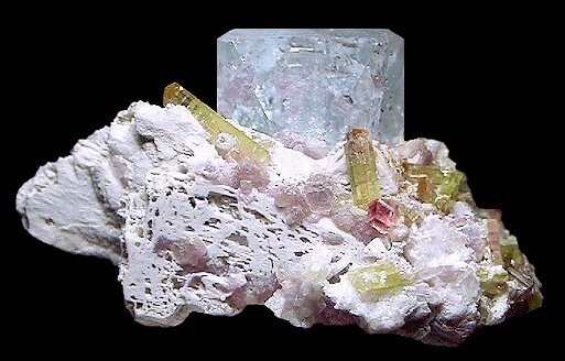 淡藍色的託帕在雪白的長石基底上與電氣石共生,奇妙的組合。