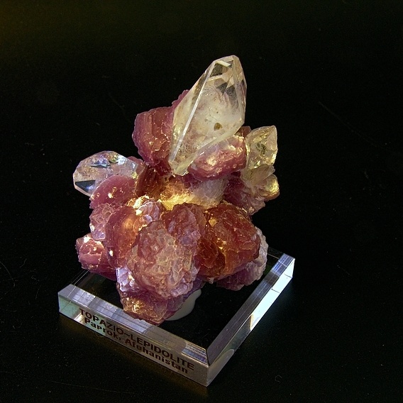 檸檬色調的託帕石和粉色的鋰雲母共生在一起,黃色的熒光似乎另有其石,不過它並沒有更多的標註了。