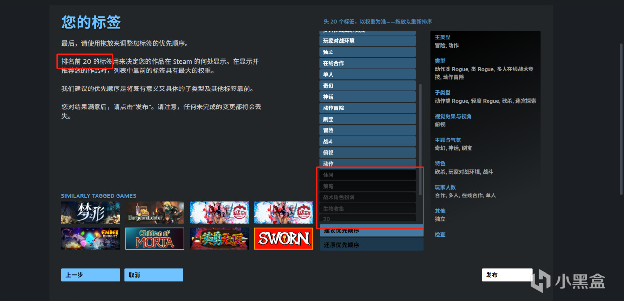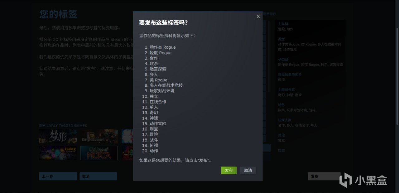 最後就來到了最後一頁“您的標籤”,這裏Steam說明了,遊戲只能有20個標籤,需要我們對其進行排序,超出的會被清理掉,所以我們之前選了那麼多,最後是能使用20個,而且越前面,權重越高,所以我們需要根據自己遊戲的類型特點來給標籤分個權重,特別是前5個,在用戶搜索的時候權重是最高的。左下角有你的遊戲排完序後的類似遊戲,你可以去看看這些遊戲是否和你的遊戲是同一類型的。
