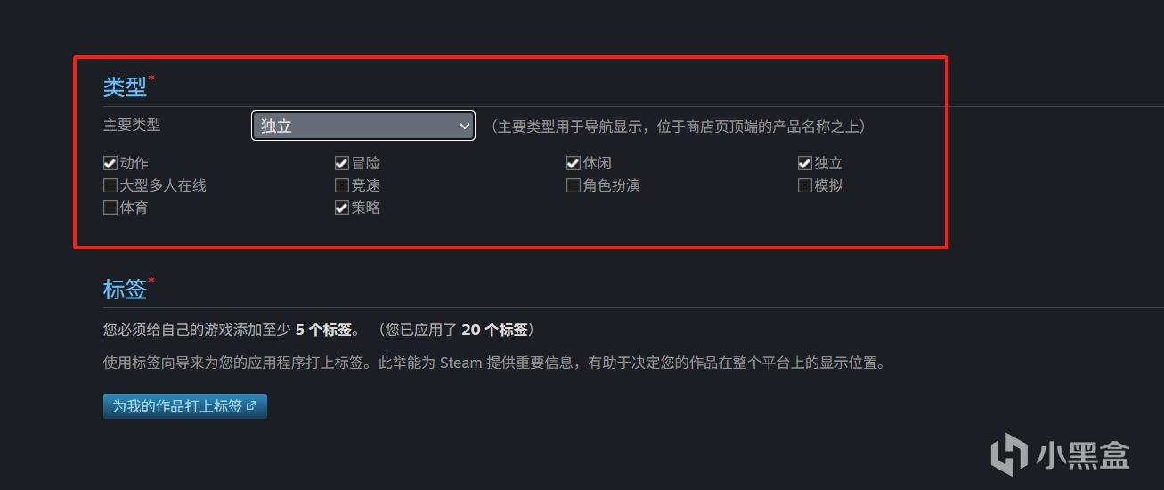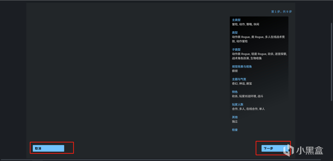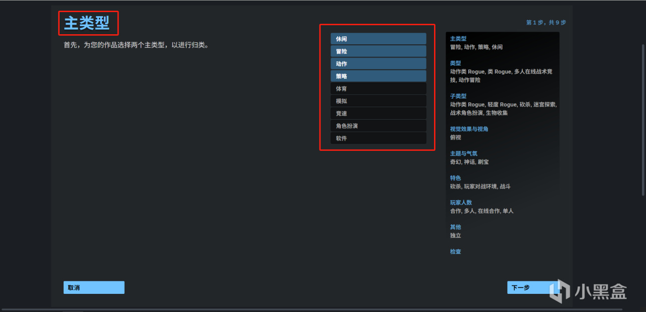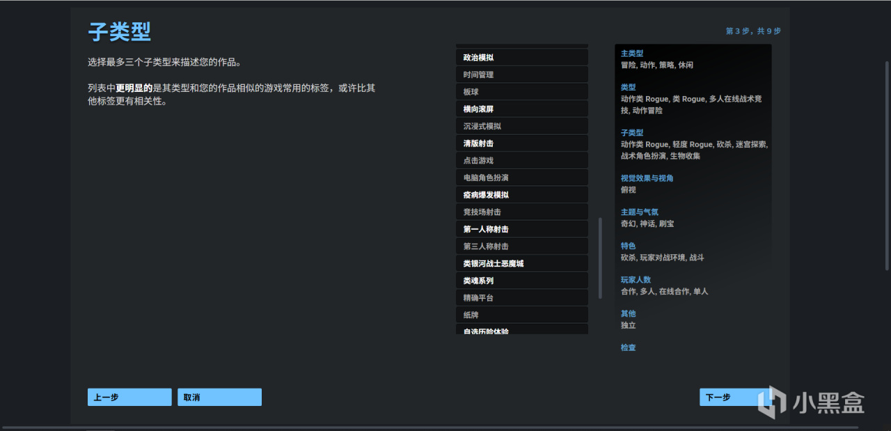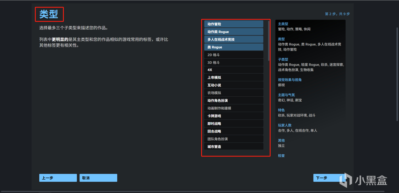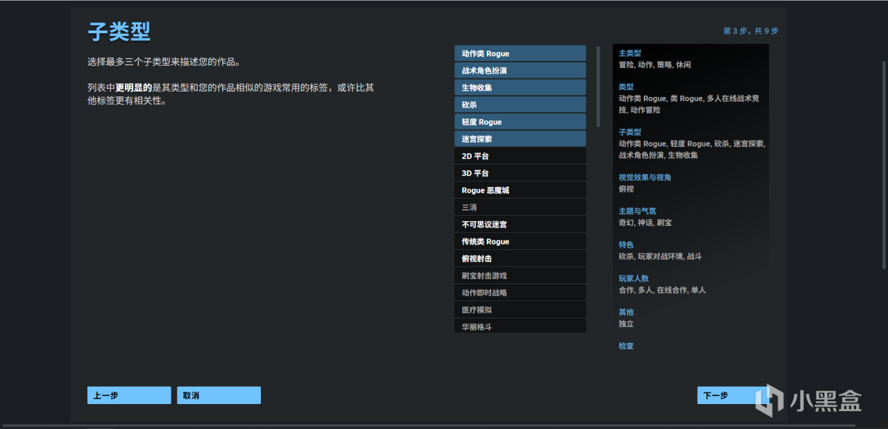 看,搞定了,多點幾下“下一步”我們就來到了類型頁面了,在這裏我們選擇了“動作類Rogue”“類Rogue”等,基本上接近的都要選一下,這樣可以增加被選中的幾率。但是不要什麼都選,因爲不符合的標籤,被用戶看到了,然後再買了,可能會被差評的。這裏的類型選項已經非常多了,咱們就不一一展示後面的了,真的非常多的分類,Steam把遊戲分類做得非常的透徹,只有你想不到,沒有它做不到的。待會給大家展示一下奇怪的標籤。
