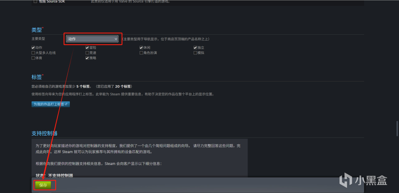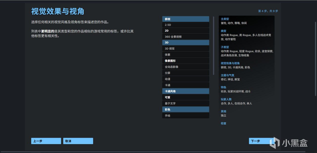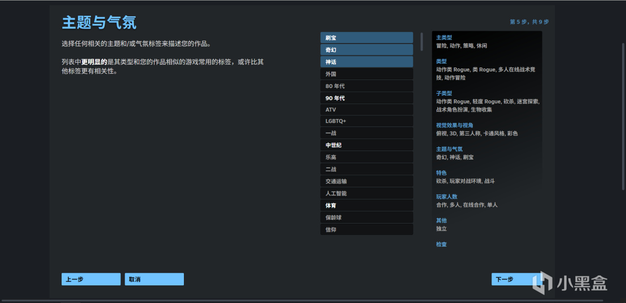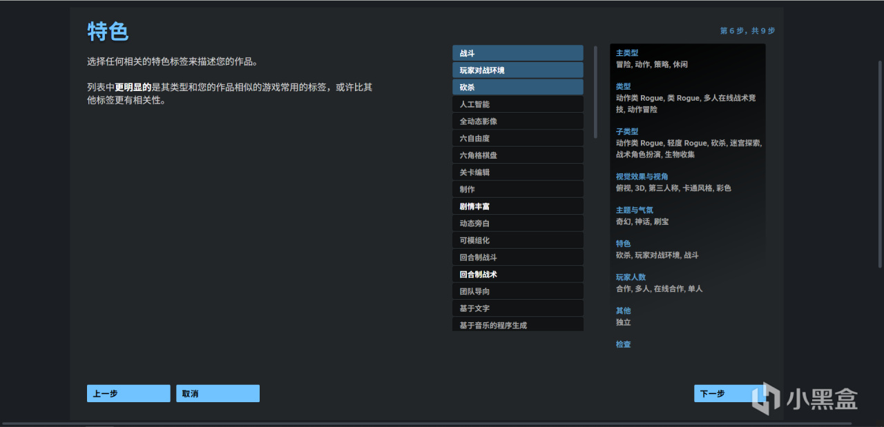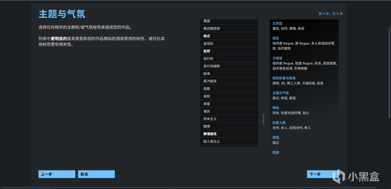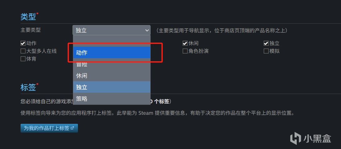 看,搞定了,多點幾下“下一步”我們就來到了類型頁面了,在這裏我們選擇了“動作類Rogue”“類Rogue”等,基本上接近的都要選一下,這樣可以增加被選中的幾率。但是不要什麼都選,因爲不符合的標籤,被用戶看到了,然後再買了,可能會被差評的。這裏的類型選項已經非常多了,咱們就不一一展示後面的了,真的非常多的分類,Steam把遊戲分類做得非常的透徹,只有你想不到,沒有它做不到的。待會給大家展示一下奇怪的標籤。