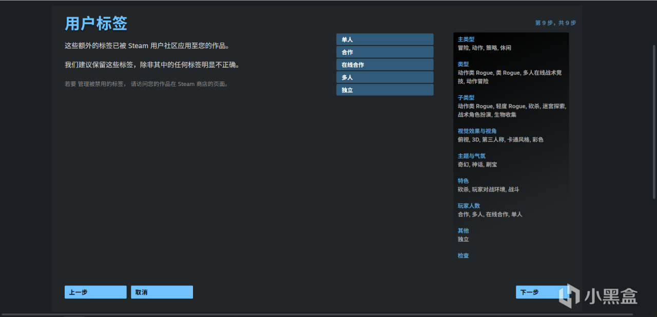然後就不知道爲什麼直接跳過第八步來到了第九步“用戶標籤”,Steam的意思是:這些額外的標籤已被 Steam 用戶社區應用至您的作品了,我們只需要找出不適合的給移除就行,我們沒有不適合的,就再點下一步吧。