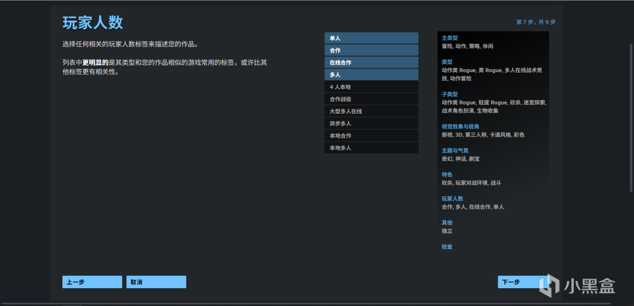來到第七步“玩家人數”,因爲我們是支持4人在線合作的,需要通過Steam的P2P進行連接,而且支持單人進行遊戲,所以就選擇了以下標籤。