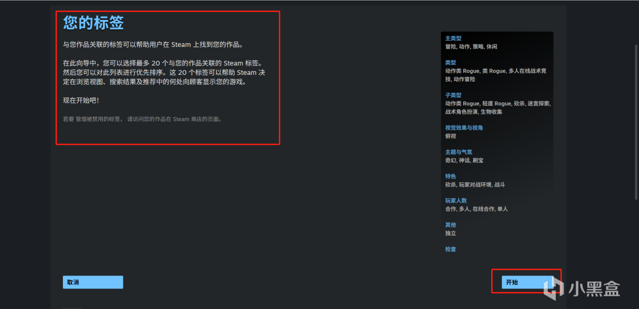 SteamWorks會打開一個新頁面,這裏就是打標籤的地方了,大家可以看到右邊已經有設置過的標籤類型了,我們只需要點擊“開始”按鈕,就可以修改我們的標籤了。