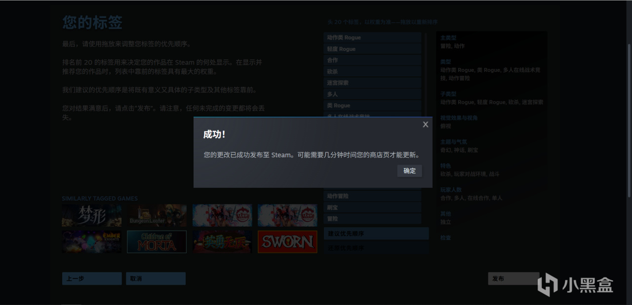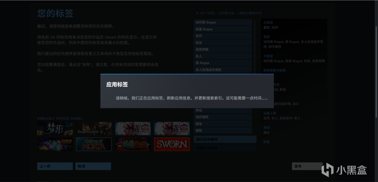 點擊“發佈”按鈕後,Steam會顯示正在應用標籤。