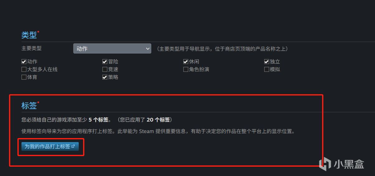 然後我們需要點擊藍色的“爲我的作品打上標籤”,這裏描述到需要給遊戲至少打上5個標籤纔行。那我們點擊“爲我的作品打上標籤”繼續。