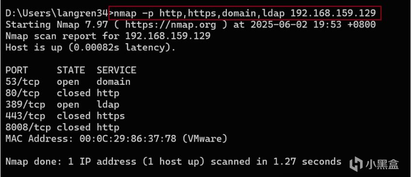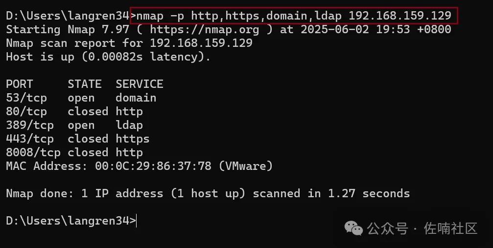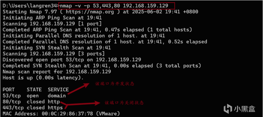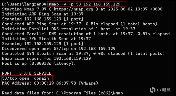 - 僅檢查目標主機的 53端口(DNS服務)是否開放。 - nmap -v -p 53 192.168.159.129