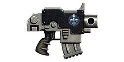技術原理:與星際戰士的爆彈槍同芯,但縮小口徑至0.50英寸,彈體刻寫《護教箴言》微型符文;擊發時,內置的銀芯與推進火藥同步燃燒,對惡魔與混沌附身者具“聖銀淨化”之效。