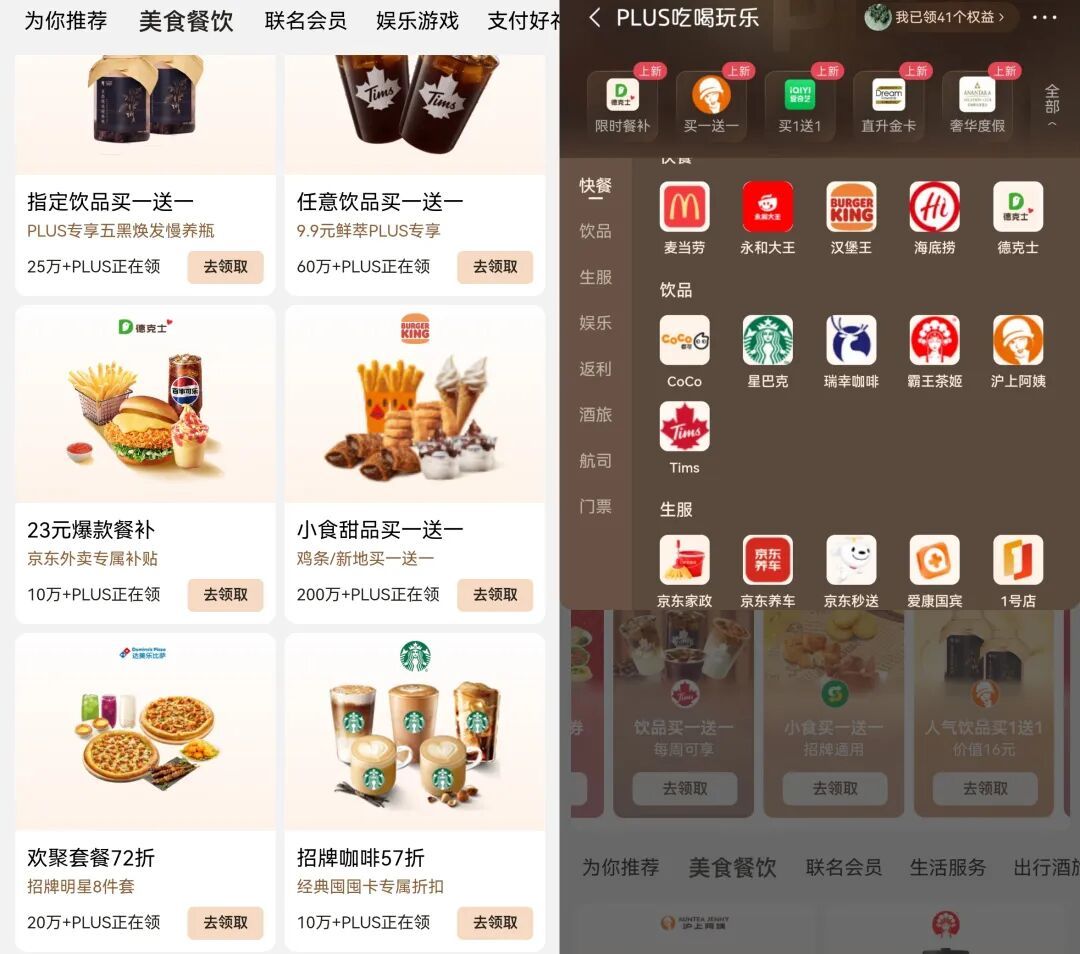 聯合肯德基、麥當勞、漢堡王、萬達電影、滴滴出行等600多家生活服務類品牌展開“生活特權”合作,涵蓋餐飲、酒店、出行、生活服務等衆多行業,比如線下飲品買一送一、外賣折扣、租車禮包、火車票券包、話費立減等。PLUS積分還可兌換洗衣、保潔等權益,在限定範圍內無需額外付費就能用。