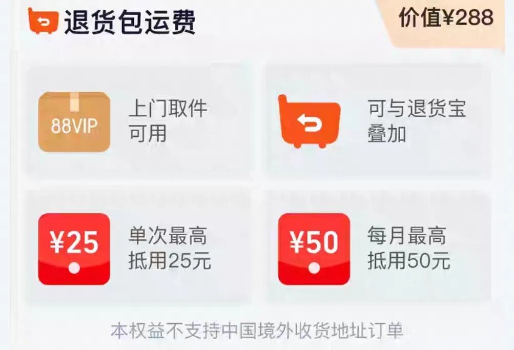 淘寶88VIP退貨在2025年2月18日0點前生效的老用戶可繼續享受無限次退貨包運費;新用戶則按新規則,每單不超25元、每月不超50元、每卡程不超288元。另外可領取8.8折菜鳥寄件特權及每月寄件券包。