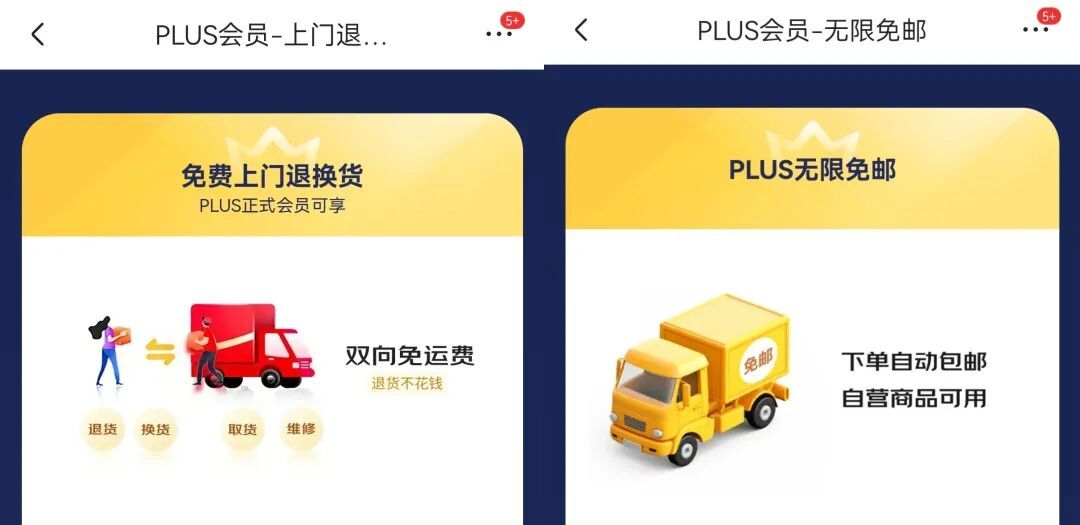 京東PLUS支持自營商品全年不限次免費退換貨且上門取件,1積分兌換1次免首重權益,每月5次拒收不扣京豆。開通PLUS+京東快遞定製年卡,有70元快遞開卡禮和每月7.5折+7.8折共5張快遞券。