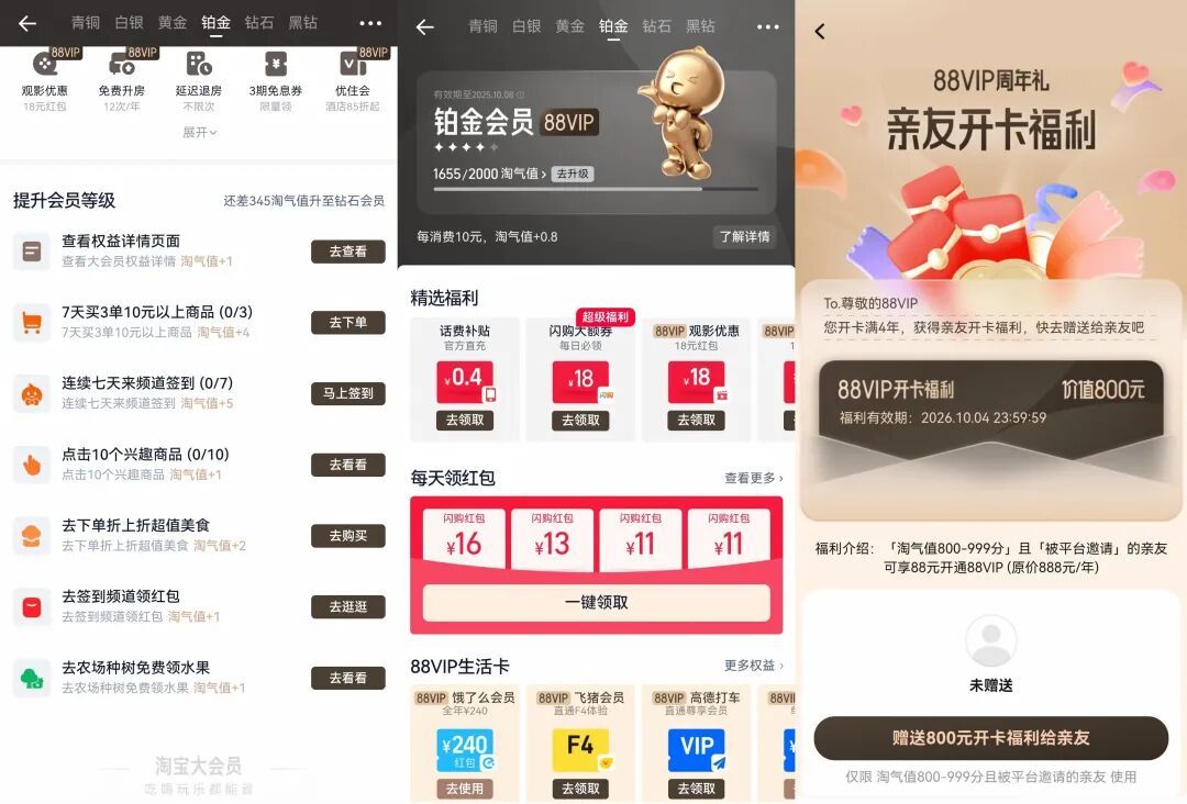 淘氣值大於800小於1000,在每月8日0點30分至下個月7日中午12點,到手機淘寶“88VIP-淘氣值”頁面完成衝刺任務,一般一個任務就能漲50左右,或者讓已開卡的朋友贈送開卡福利,不用做任務就能直接88元開通。