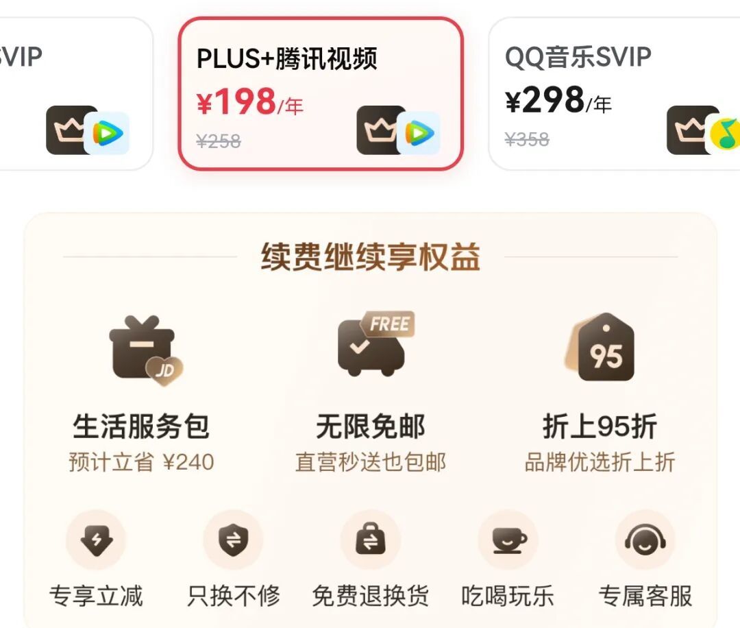 京東PLUS顯然適合注重物流和售後效率、經常進行線下生活類消費(比如買飲品、洗車等)的人羣。但是如果還想配個影音會員的話成本就得提升不少。
