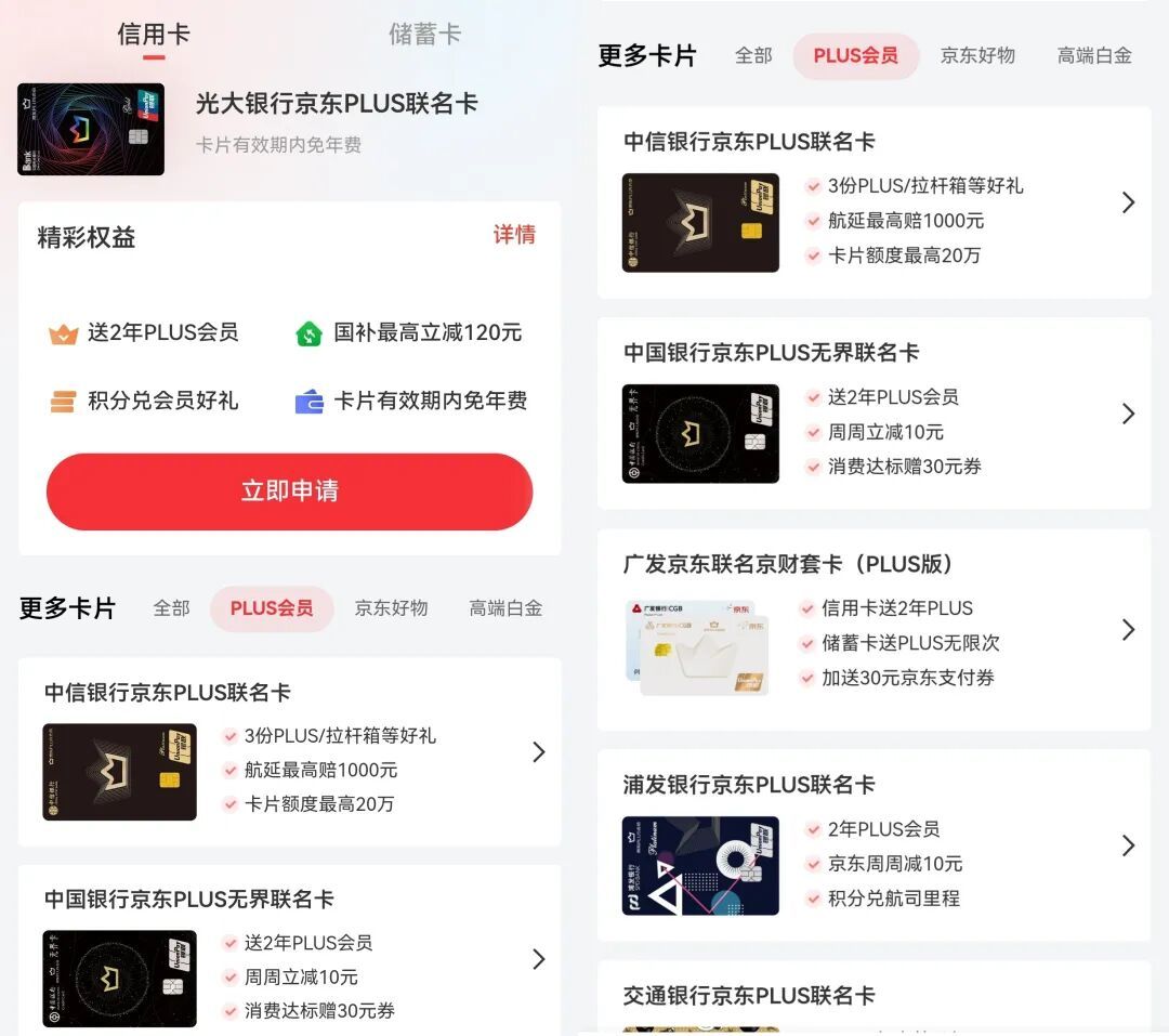 首先是京東PLUS會員,有信用卡使用需求的話可在京東金融APP的信用卡或京東APP的PLUS頁面辦理PLUS聯名卡,有不少卡送2年PLUS權益,甚至還有送無限次的。