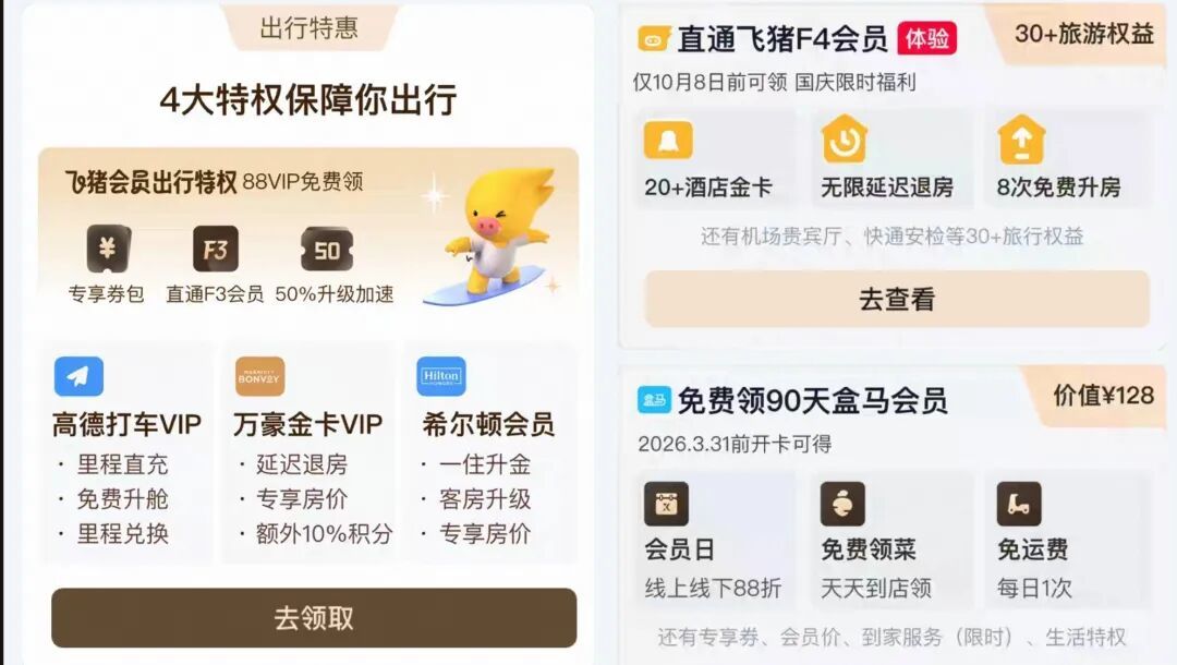 88VIP包含餓了麼超級喫貨年卡(限生活卡或全能卡領取)、飛豬旅行全年酒店立減200元、高德打車每月30元現金券、萬豪金卡、希爾頓一住升金等權益。另外還贈送90天盒馬會員,會員日可線上線下88折,每天1次免運費。