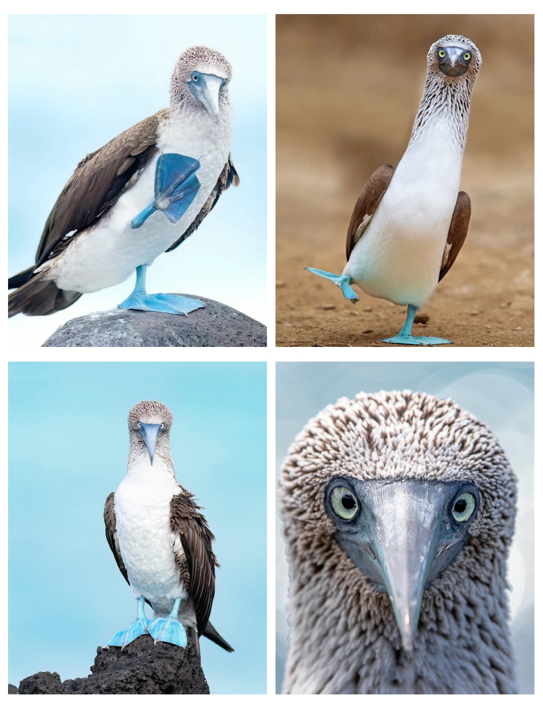 藍腳鰹鳥是鵜形目鰹鳥科鰹鳥屬鳥類,又叫結巴鳥。嘴粗壯,近似圓錐形,上下嘴緣都爲鋸齒狀,嘴喙上沒有鼻孔,喉囊發達,翅膀狹窄,長而尖,脖子粗壯。鳥喙爲暗綠色、藍色或灰色;眼晴呈黃色,雌鳥的瞳孔較雄鳥稍大,臉上的皮膚黝黑並有奇異的眼袋,頭部和頸部有濃重的棕色和白色條紋,翅膀、尾巴和下體爲黑褐色,背面和腹部羽毛爲白色,腳蹼爲藍色。藍腳鰹鳥主要分佈在美國南加利福尼亞到祕魯北面的太平洋地區,喜歡棲息於熱帶海洋、海岬和島嶼上。除了繁殖期以外,大多數時間都在海上活動。社會性活動,常成小羣飛行於海面的上空或者在海面上游泳,有時能聚集200只以上的羣體進行集體捕食活動。主要食物爲魚類,如沙丁魚、鳳尾魚、鯖魚以及一些魷魚和飛魚等。藍腳鰹鳥是加拉帕戈斯羣島色彩最豐富的鳥類之一,已成爲瀕危鳥類,被列爲中國國家二級保護動物。