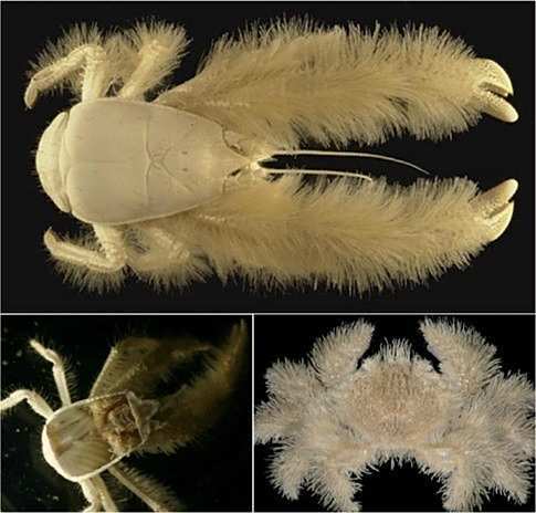 雪人蟹(學名:Kiwa)是雪人蟹科雪人蟹屬的甲殼動物,全身覆蓋絲狀絨毛,體長約15釐米,螯部密佈黃色細菌羣落且無視覺功能,包含K. hirsuta和K. puravida兩個物種。其剛毛結構與中華絨螯蟹相似,因形態獨特被獨立歸爲基瓦科。 雪人蟹棲息於南太平洋2194米深的深海熱泉區,通過揮動螯部使細菌接觸熱泉化學物質,並以梳狀口器攝入細菌顆粒。其絨毛中的絲狀細菌可中和熱泉毒素,適應劇毒環境。該物種2005年被發現,以吉尼斯認證“毛最濃密的甲殼動物”著稱。