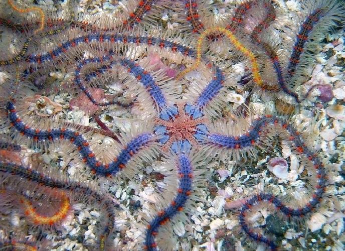 海蛇尾,是棘皮動物門蛇尾綱動物,有2000多種,是棘皮動物中種類最多的一族。其外形似海星,體盤和腕分界明顯,腕細長,內臟不伸入腕內,腕內部骨骼呈椎骨狀,椎骨彼此靠關節相連;沒有肛門,口在腹面中央。海蛇尾有的腕前伸,有的腕拖後,像蠕蟲彎曲蠕動,又像蛇蜿蜒前行,故名。海蛇尾在中國分佈於黃海,世界各大海洋均有分佈。海蛇尾有羣居習性,常常集羣出現,動作靈敏,運動本領較強,能沿着海底爬行,以海底淤泥中的有機物碎屑爲食。海蛇尾是一類可以產生生物熒光的深海生物物種,在受到攻擊或感到有危險時,很容易將部分腕甚至整個腕斷掉,以此吸引天敵的注意力,然後乘機逃走。海蛇尾的再生能力較強,斷去的腕可以長成新的個體,失去腕的個體又可以長出新的腕。