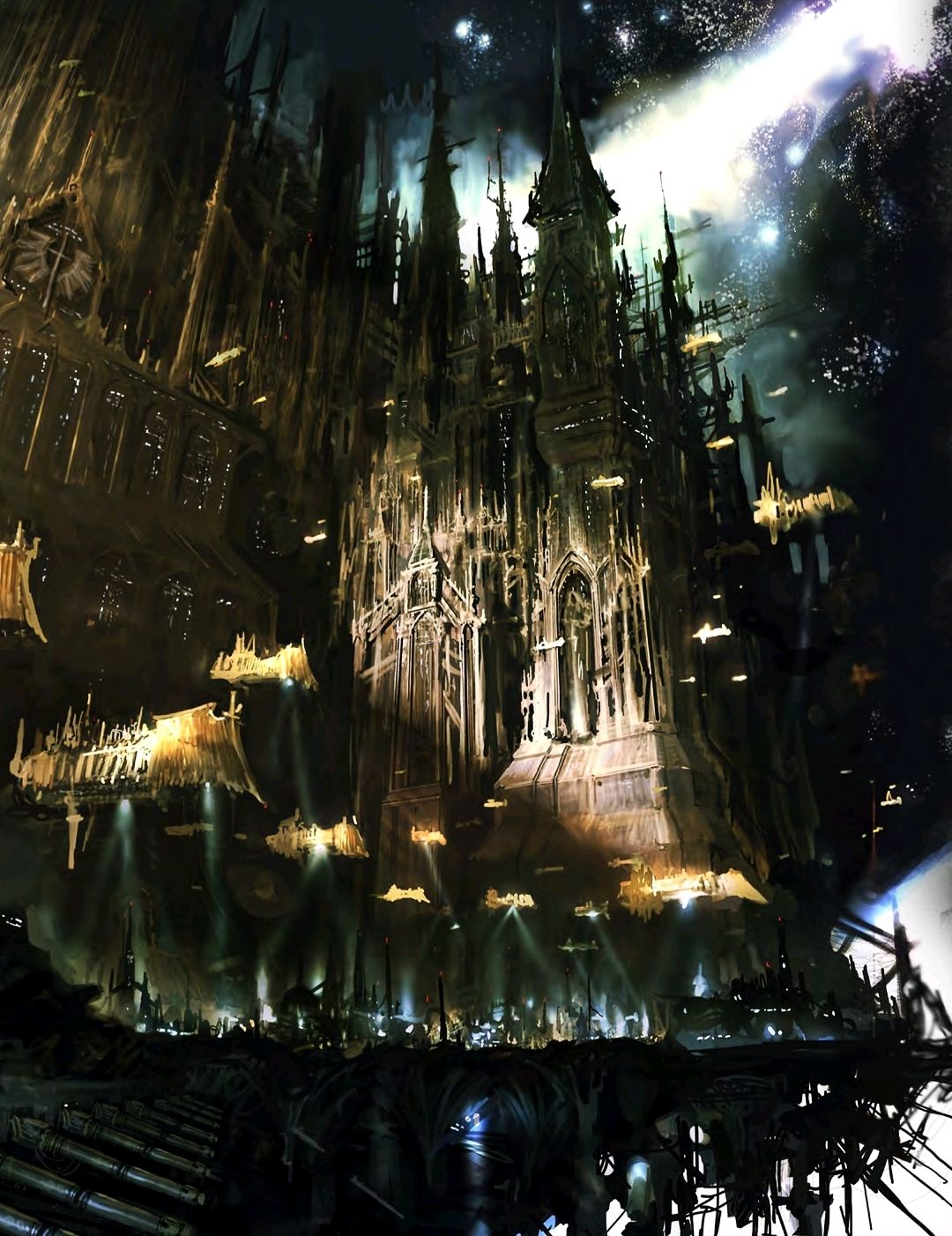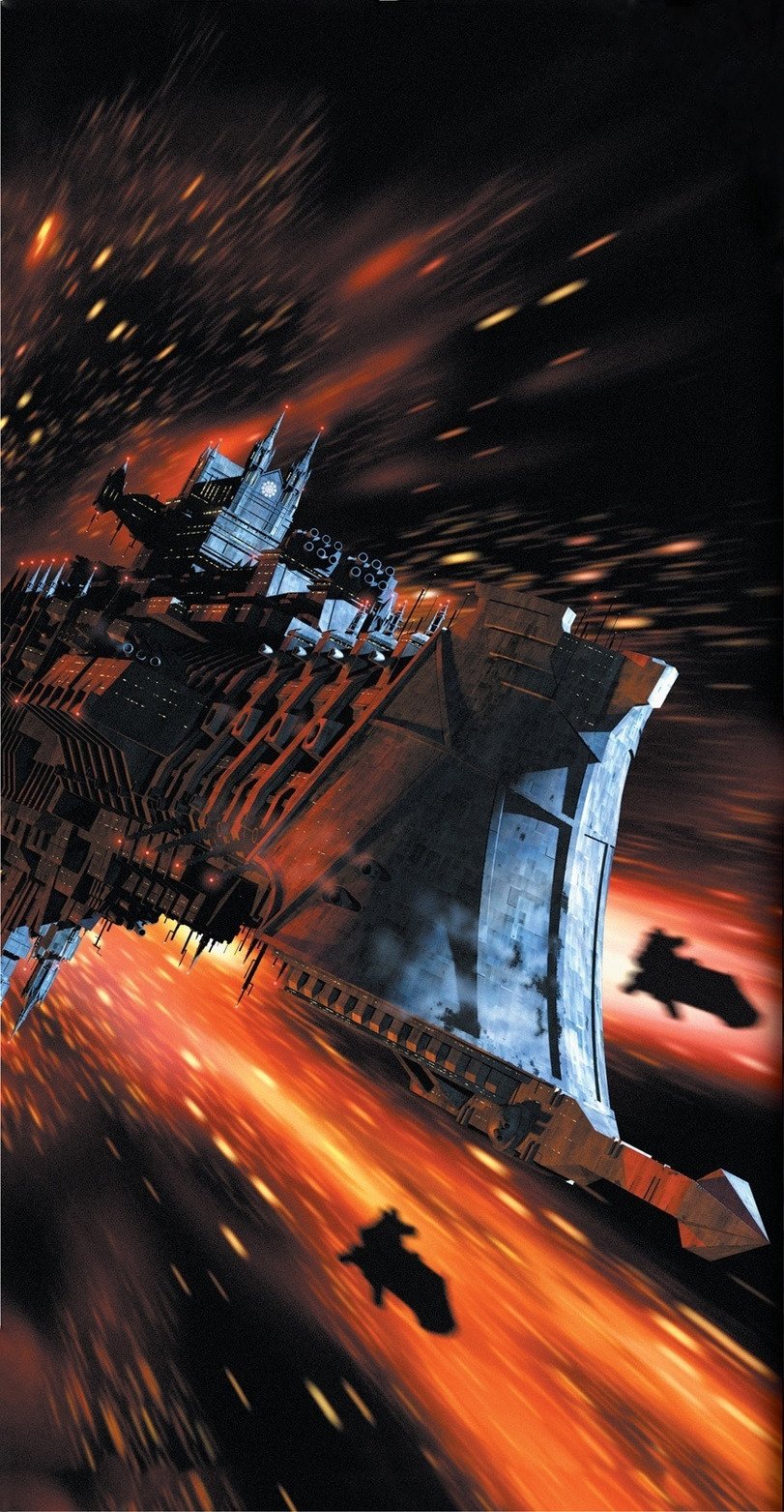 戰錘40K的視覺作品(模型、插畫、遊戲畫面)多采用暗沉色調,以黑、灰、暗紅、深金爲主,搭配爆炸的火光、靈能的藍光與鮮血的猩紅,營造出“絕望中掙扎”的氛圍。無論是行星表面的戰場廢墟,還是星艦之間的太空激戰,都充滿了史詩感與殘酷感,讓觀衆直觀感受到“黑暗未來”的衝擊力。