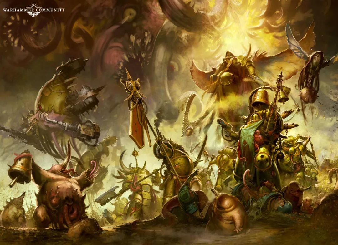- 納垢(Nurgle):掌管腐朽與瘟疫的“慈父”,聖數字7,其“賜福”實爲毀滅性病菌,神域“納垢花園”是病菌滋生的樂園,坩堝中盛滿滅絕文明的瘟疫。