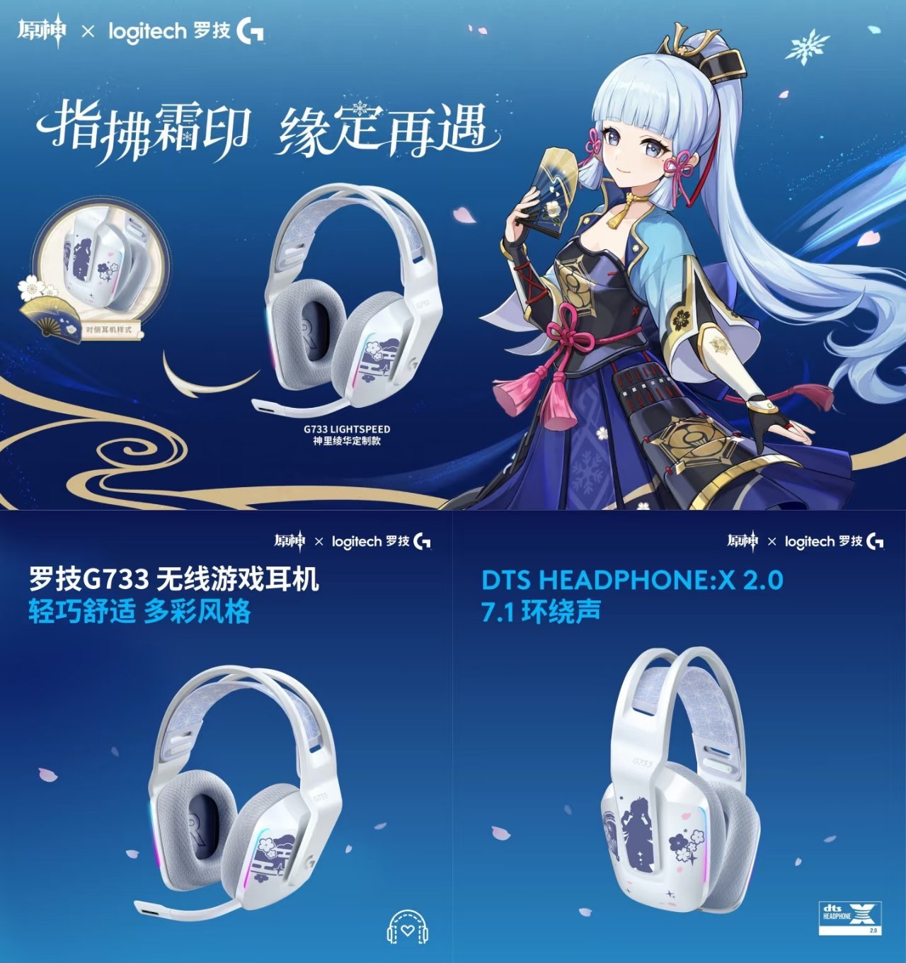 羅技此次推出的特別版 G733 外觀設計從神裏綾華的“白鷺公主”形象汲取靈感,風格輕柔淡雅。這款耳機採用 40mm PRO-G 驅動單元,具備雙區可自定義智能炫光,支持 DTS 7.1 環繞聲和 BLUE VO!CE 麥克風技術;此外每當用戶啓動 / 關閉設備時,都能聽到來自神裏綾華的語音問候。