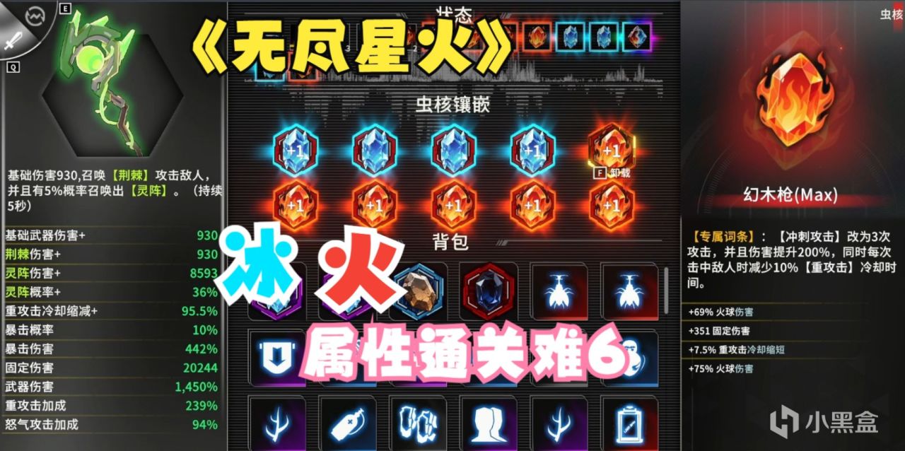 不同的是,《無盡星火》舊瓶裝新酒,將肉鴿build融合進了清版過關,武器與蟲核提供的屬性與buff組合加持,增加了傷害與數值,玩家變身移動炮臺,走到哪轟到哪裏,技能滿屏飛,華麗程度不輸“毒奶粉”。