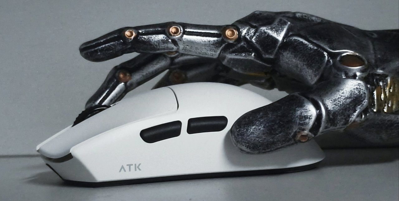 鼠標的左右側面大家可以看到ATK的一個LOGO與產品型號。除去常規的側鍵外,你是可以看到兩側做了一個內凹的設計,可以使得我們在使用的過程中大拇指更好發力,緊緊地扣住鼠標,支持性非常不錯。