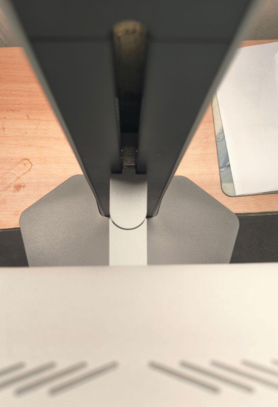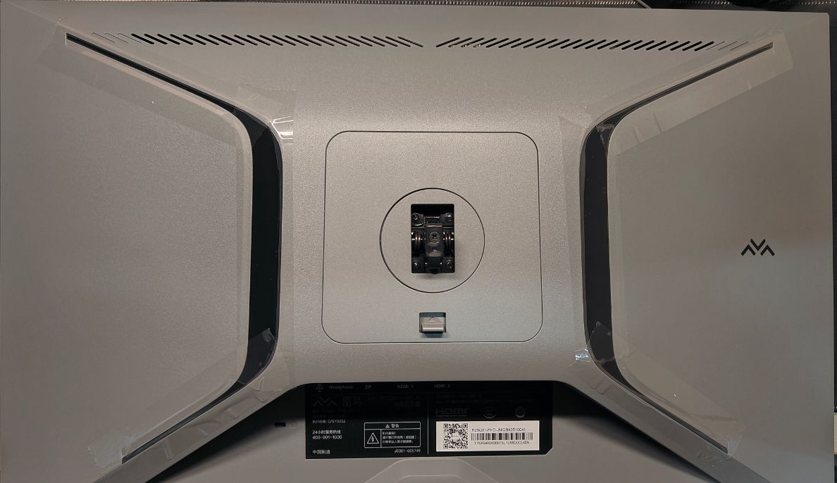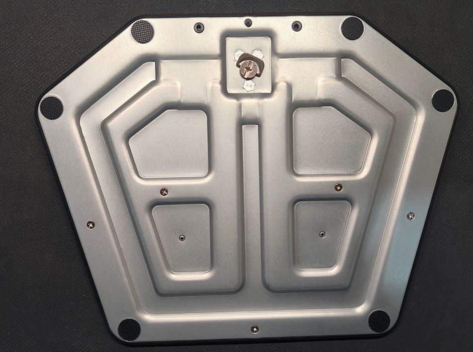 底部底座爲金屬材質,採用更不佔空間的六邊形(可以放一些手辦等裝飾),且帶有六個圓形的橡膠防滑貼,保證顯示器的穩定性。