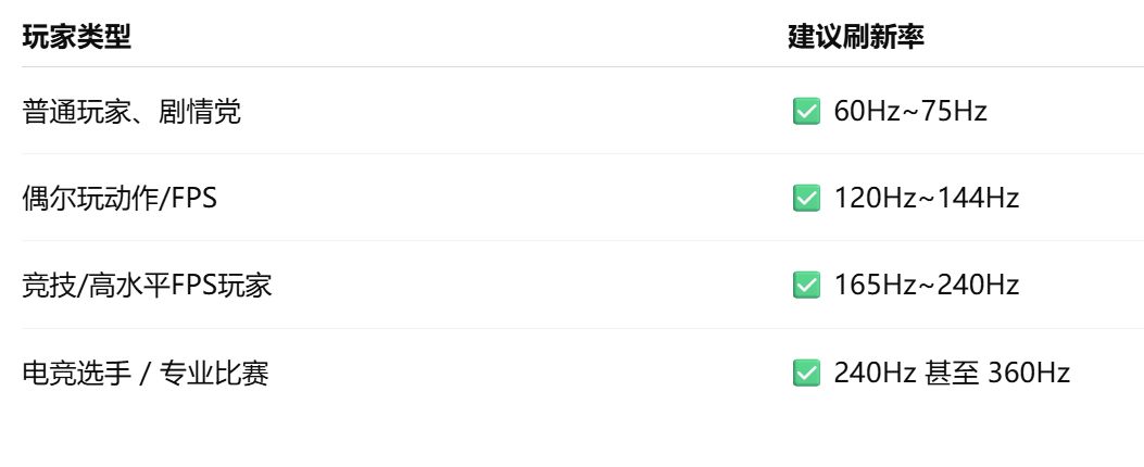 一般來說,打遊戲有60Hz基本就夠了,如果想要有更好的表現,那當然是越高越好(前提是電腦帶的動)。不過如果你是FPS玩家的話,推薦是越高越好。高刷新率能帶來更快的響應速度,也能明顯感覺到畫面撕裂和拖影等的減少。