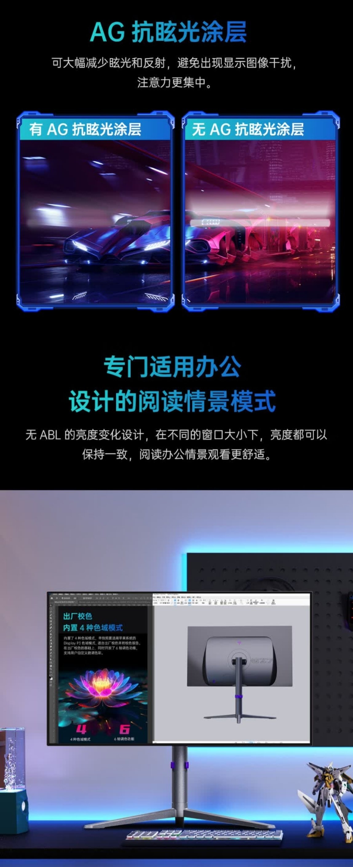 需注意,因爲是QD-MiniLED技術,很難做硬件低藍光,所以只有軟件上的低藍光設置,調光方式爲DC調光。想要滿血輸出2K 240Hz 10bit(8抖10)規格,仍然走的是DP1.4接口,HDMI爲2.0版本。