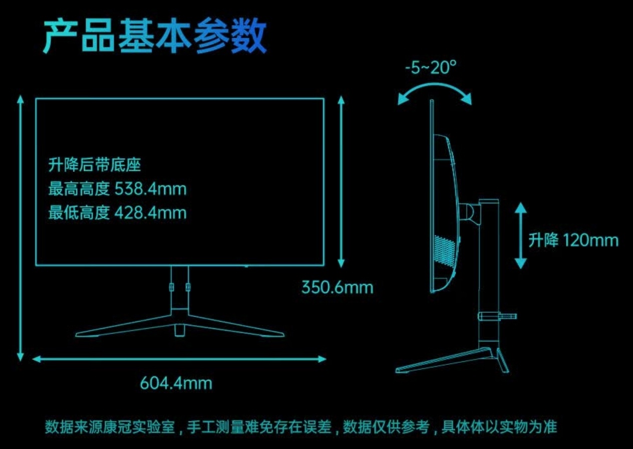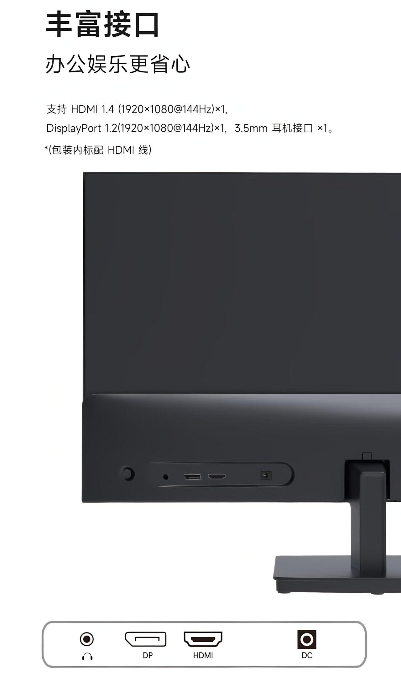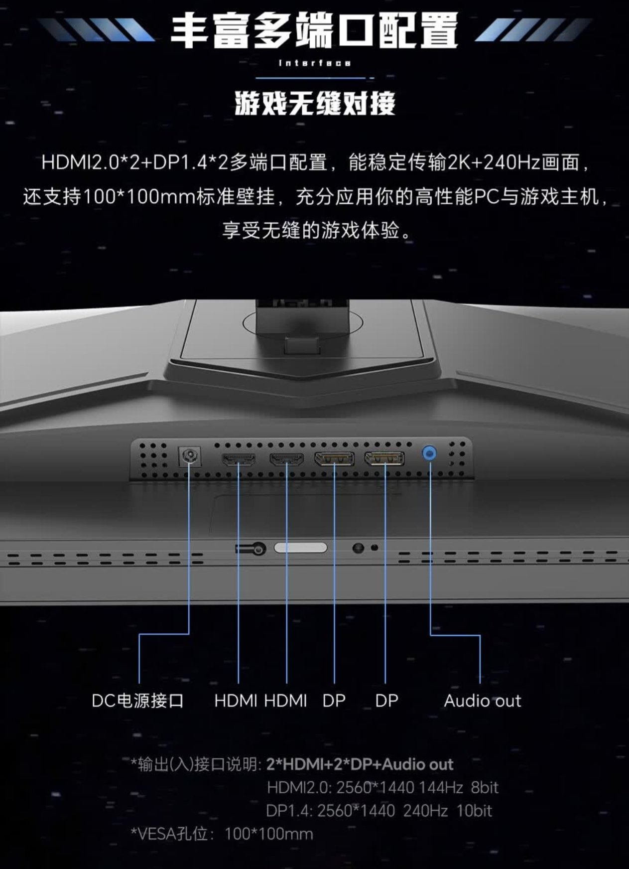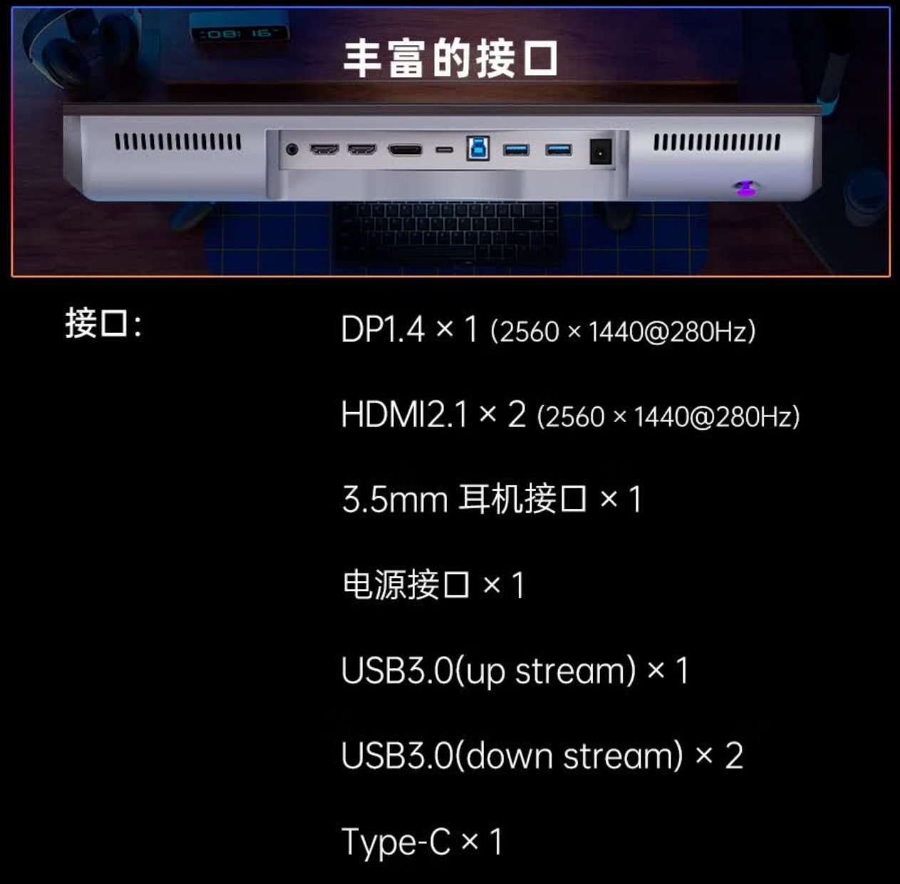 接口上,配備有兩個HDMI2.1和一個DP1.4,底座提供升降、旋轉和俯仰調節功能。