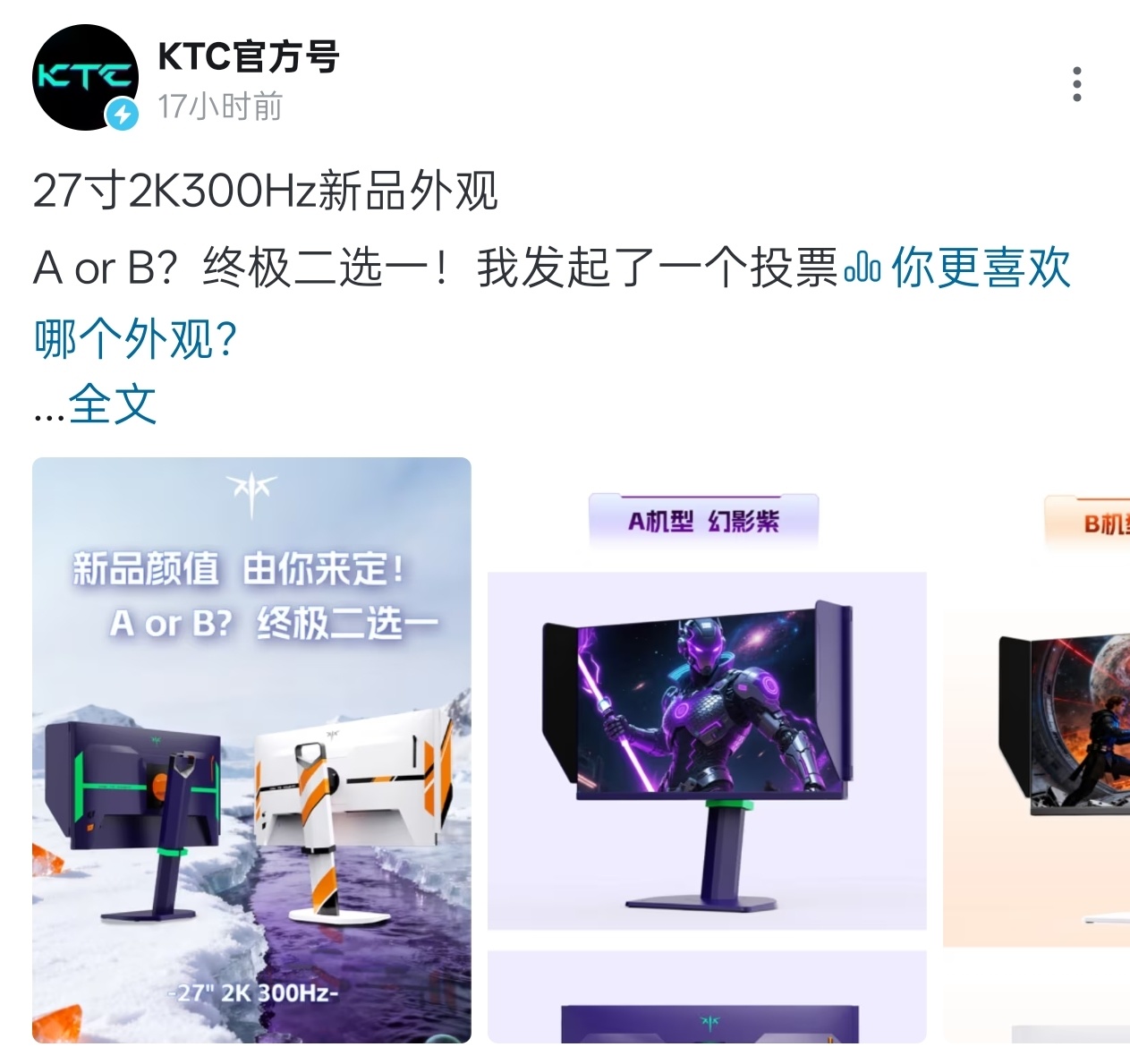 插句題外話,昨天KTC的B站官方號在動態裏搞了一個新品外觀投票,瞧這意思,不久將推出一款大師系列外觀的27英寸2K 320Hz顯示器。