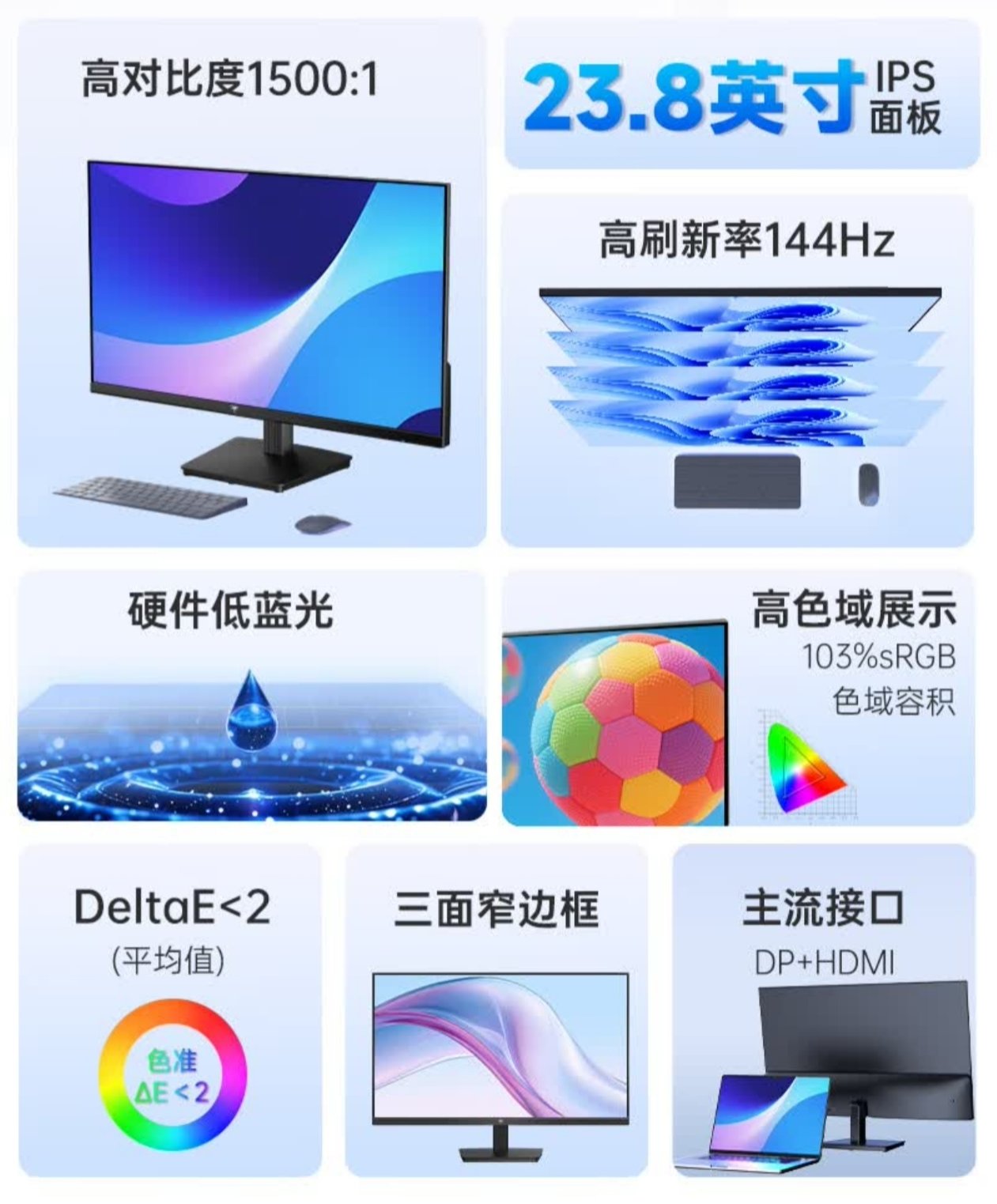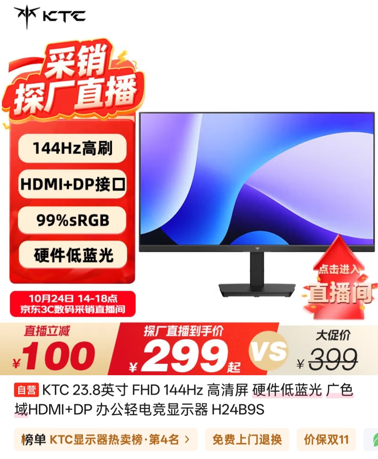KTC的另一款新品直播間價格同樣令人興奮,一款299元的23.8英寸 1080P 原生144Hz 300nit亮度 覆蓋99%sRGB色域 支持硬件低藍光的IPS顯示器,型號爲H24B9S,就這價格,還能說什麼?牛掰就對了!但數量有限,手慢無。等兄弟們看到這篇文章的時候,估計搶完了都……