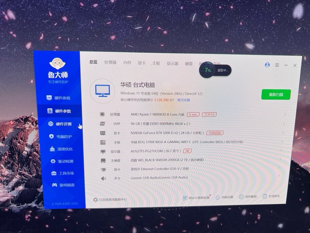 • 主板:華碩ROG B850-A WIFI S吹雪主板採用AM5插槽,支持AMD銳龍9000等系列處理器。配備4個DDR5內存插槽,最高支持256GB內存,頻率可達8000+MT/s(OC),還支持AMD EXPO內存超頻技術。擁有多個M.2插槽和豐富的接口,集成Intel 2.5Gb以太網和Wi-Fi 7無線網卡,網絡連接性能出色。
