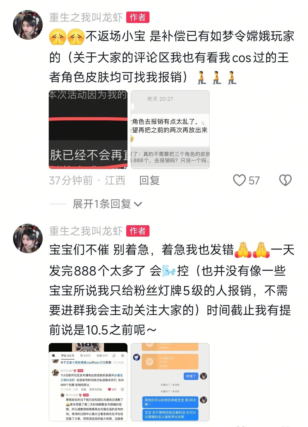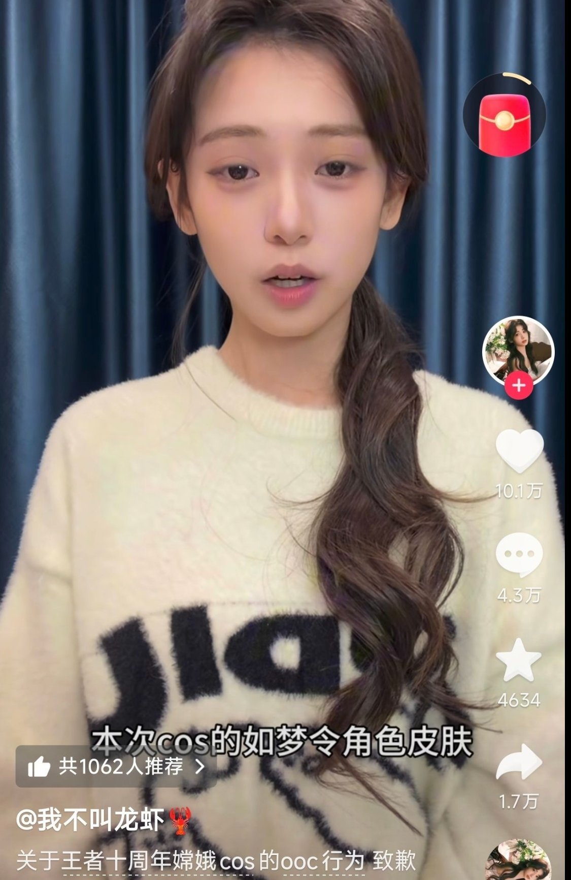 10月28日,該博主發佈道歉視頻,承認其行爲“嚴重OOC”(脫離角色設定),並向嫦娥玩家及官方致歉。她宣佈不收取本次活動費用,並承諾爲888名嫦娥玩家報銷“如夢令”皮膚(價值888點券),總補償金額約7.8萬元。