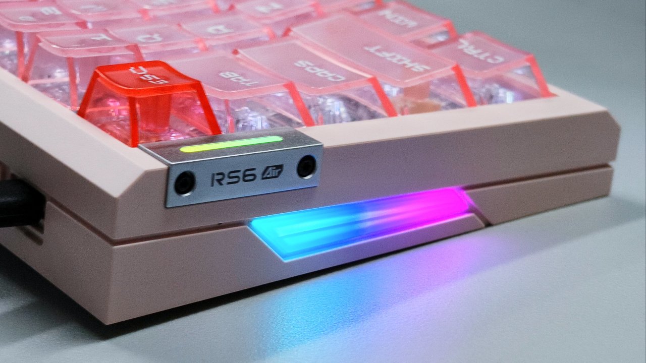 再加上RS68 AIR此次的鍵帽也是PC材質,粉色霧透的像素大字符樣式。因此此次的燈光體驗無疑是槓槓的,顏值非常高,光線柔和均勻,你也不用擔心手感不行,原廠高度的鍵帽還是OK的。