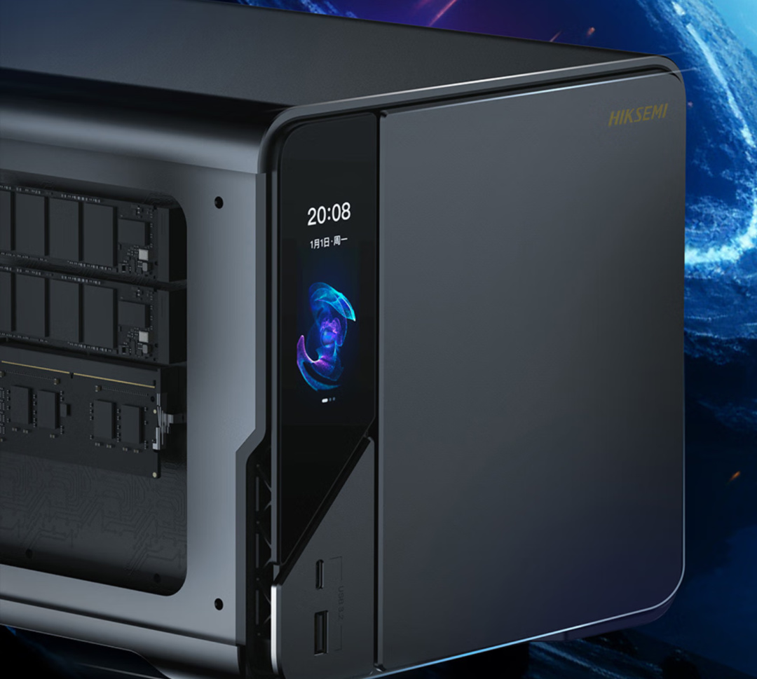系統是海康自家的,照片管理、影視、Docker等需求都能滿足,不過整體應用生態不算豐富,喜歡折騰也可以刷黑羣。相對其他產品,這款NAS最大的特點是帶有一個2.86英寸的智控顯示屏,支持300nits亮度、360PPI和60Hz刷新率,顏值上會高一點。