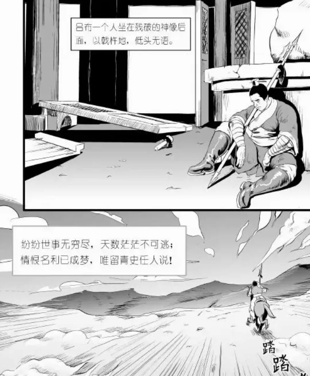 而漫畫最有韻味的在於,呂布最後回到了初次與董卓相遇且相交時的那個破廟,故事達成了閉環,而呂布從此浪跡天涯,亂世的悲劇色彩與愛而不得的怨恨,自此由筆間刻畫而出,直指16年後的今天。