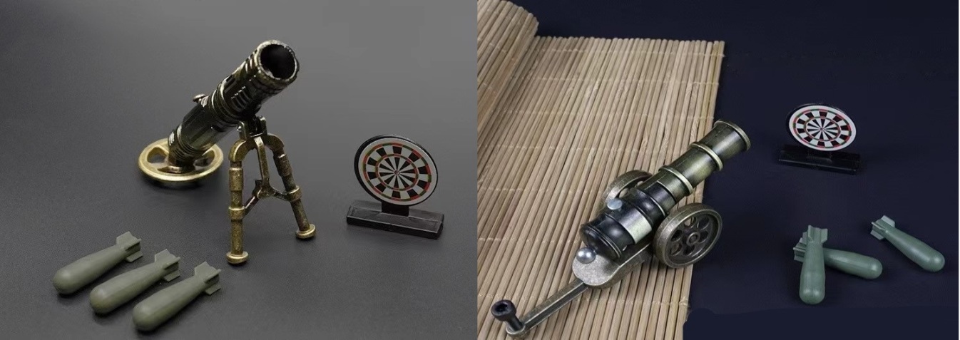 模型通常是金屬製成的,具備發射功能(即放入炮彈玩具,由彈簧帶動推杆射出)。平時可以放在桌上當擺件,也能用來練習遠程打靶來解壓。有條件的話,過年的時候還可以用來發射飛毛腿/魚雷等煙花。
