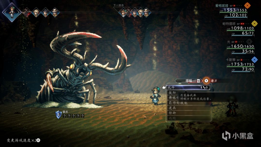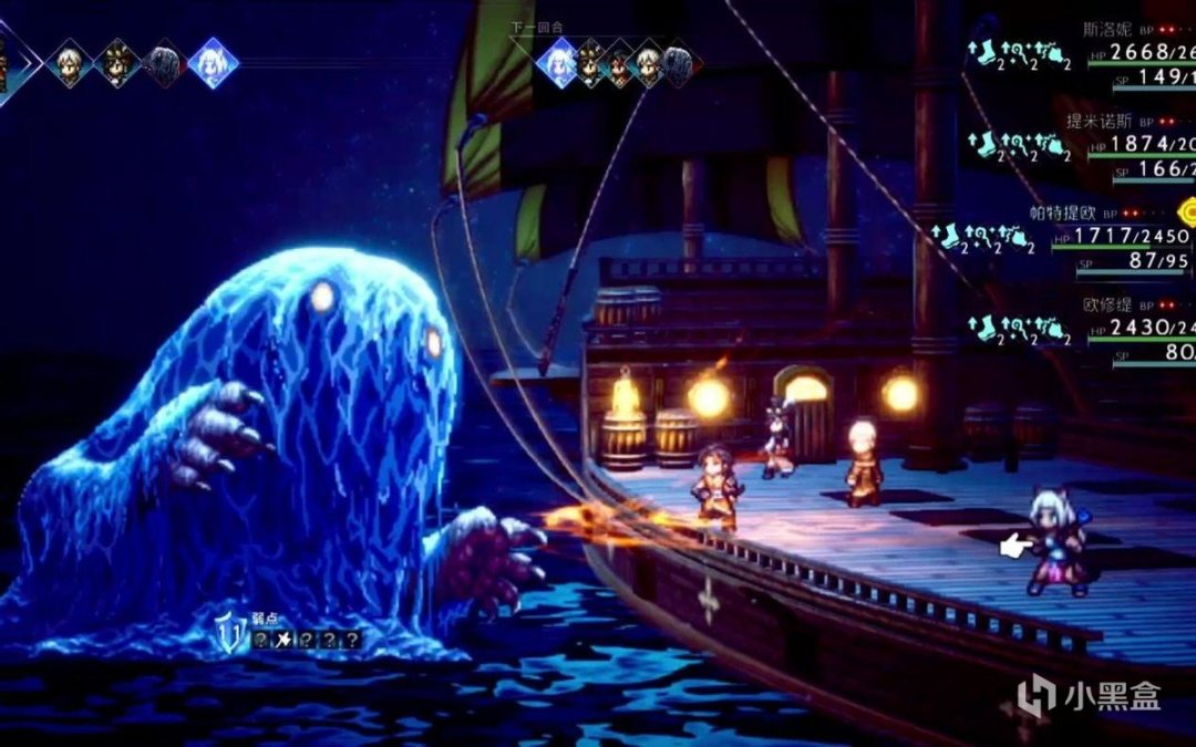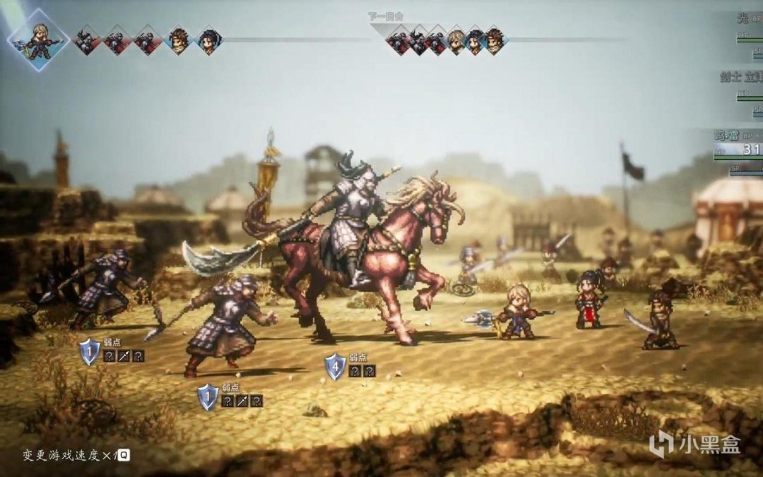 說到職業搭配的作用,這就要介紹本作的戰鬥系統了。雖然近年來也有類似《女神異聞錄5》那樣玩家口碑良好的回合製作品,但是玩家們也一直期待着傳統回合制戰鬥還能不能做出更好玩的花樣。對此八方旅人給出的答案就是兩個詞:增幅和破防。玩家在戰鬥中可以積累稱爲BP的增幅點數,消耗BP可以增強角色幾乎所有的行動——增加攻擊次數,增加攻擊力,增加回復量,增加BUFF時間等等。而破防則是RPG常見的通過攻擊敵人弱點屬性,從而製造敵人停頓的打法,這東西聽起來司空見慣。但是八方的敵人卻有護盾值設定,必須打出足夠次數的剋制屬性攻擊,讓敵人護盾值歸零才能達成破防。