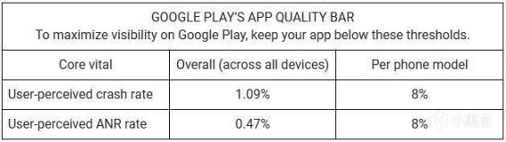 我們先了解一下新系統,它的規劃中,收集的不只是應用程序在使用時的崩潰頻率,還包含煩人的凍結時間數據。 谷歌決定將兩者的一般標準設定在1%左右。 更有趣的是,它還在特定設備上收集這些數據,主因在於某些應用程序可能存在對某些特定硬件的衝突,不是每個人都會在同一款應用上遇到同樣的問題。 但若是一個應用程序開始在同一款手機上以高於8%的機率崩潰,這將會觸發Play商店的警示。