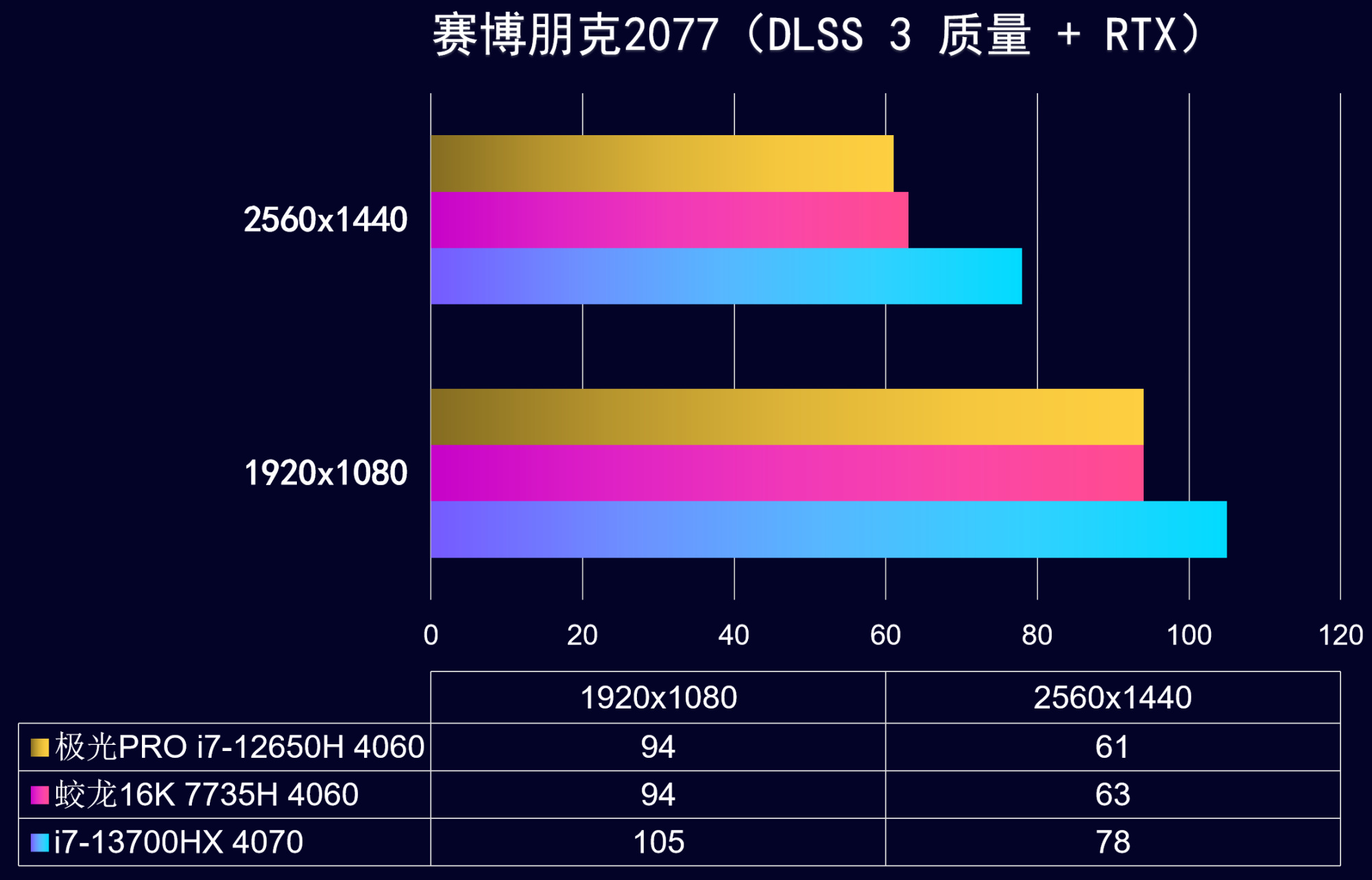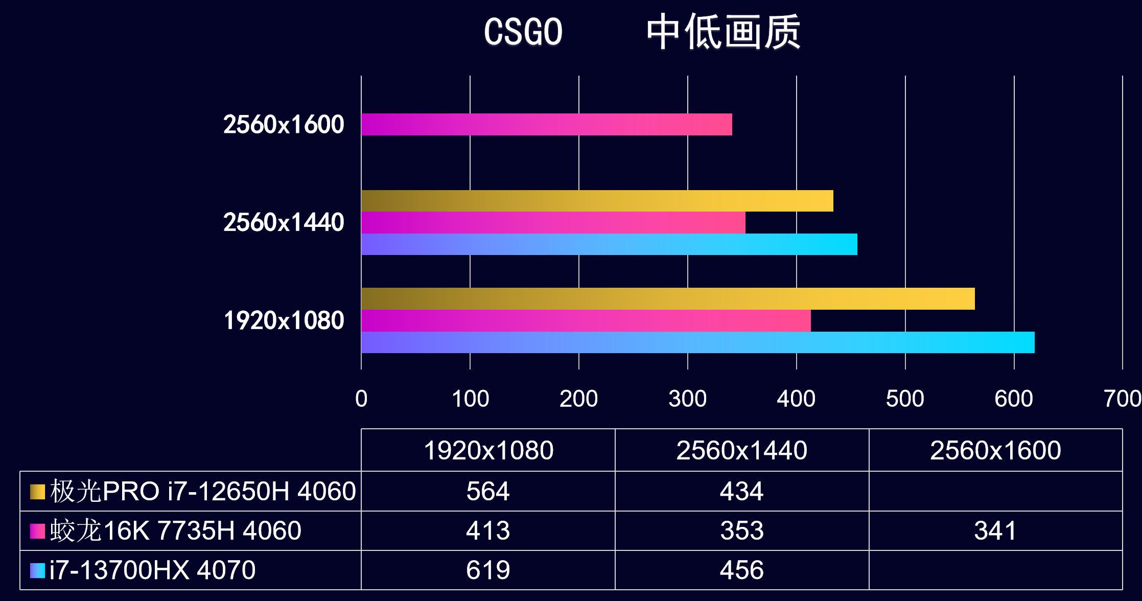 CSGO這款遊戲比較喫CPU單核性能,極光PRO i7-12650H 4060,實測與i7-13700HX 4070差距並不大,顯卡性能的影響因素一般。