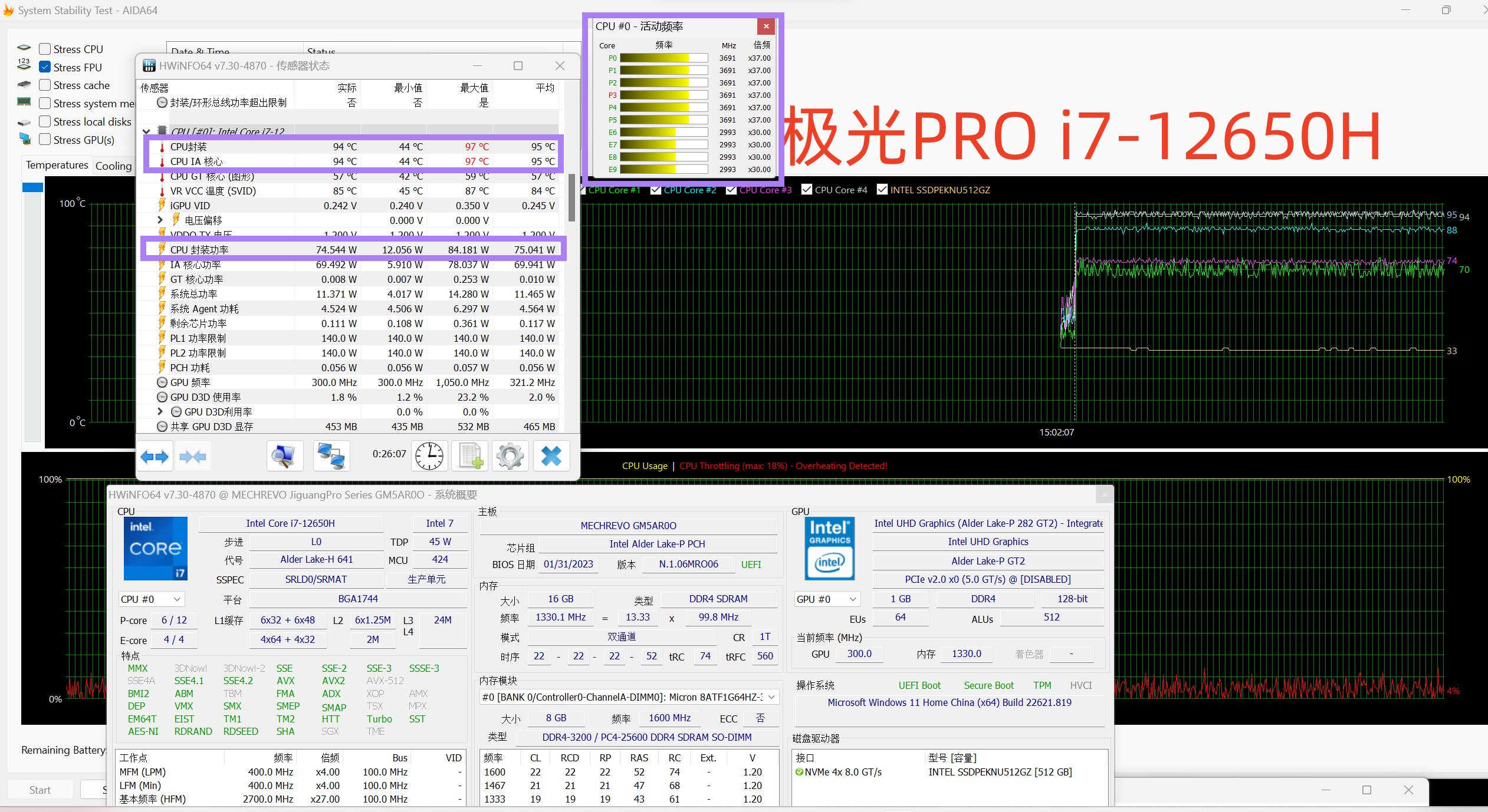 極光PRO性能釋放更高,溫度更低。單烤CPU,P核頻率3.69GHz,E核2.99左右,溫度94度,功耗在74.5W左右