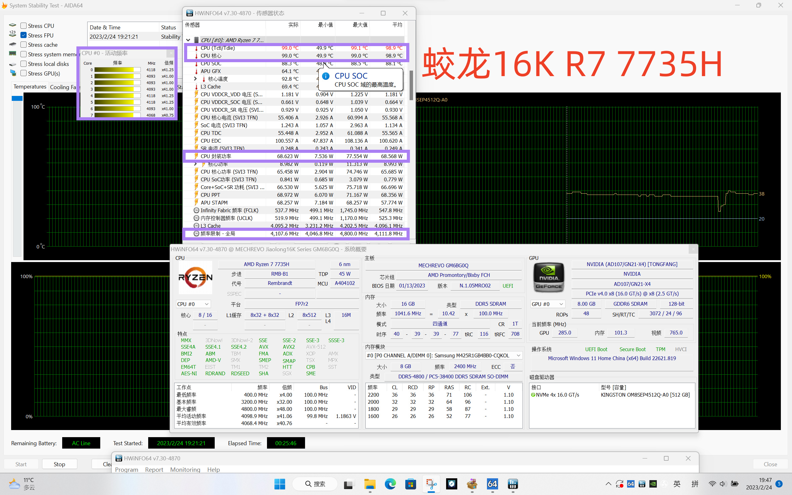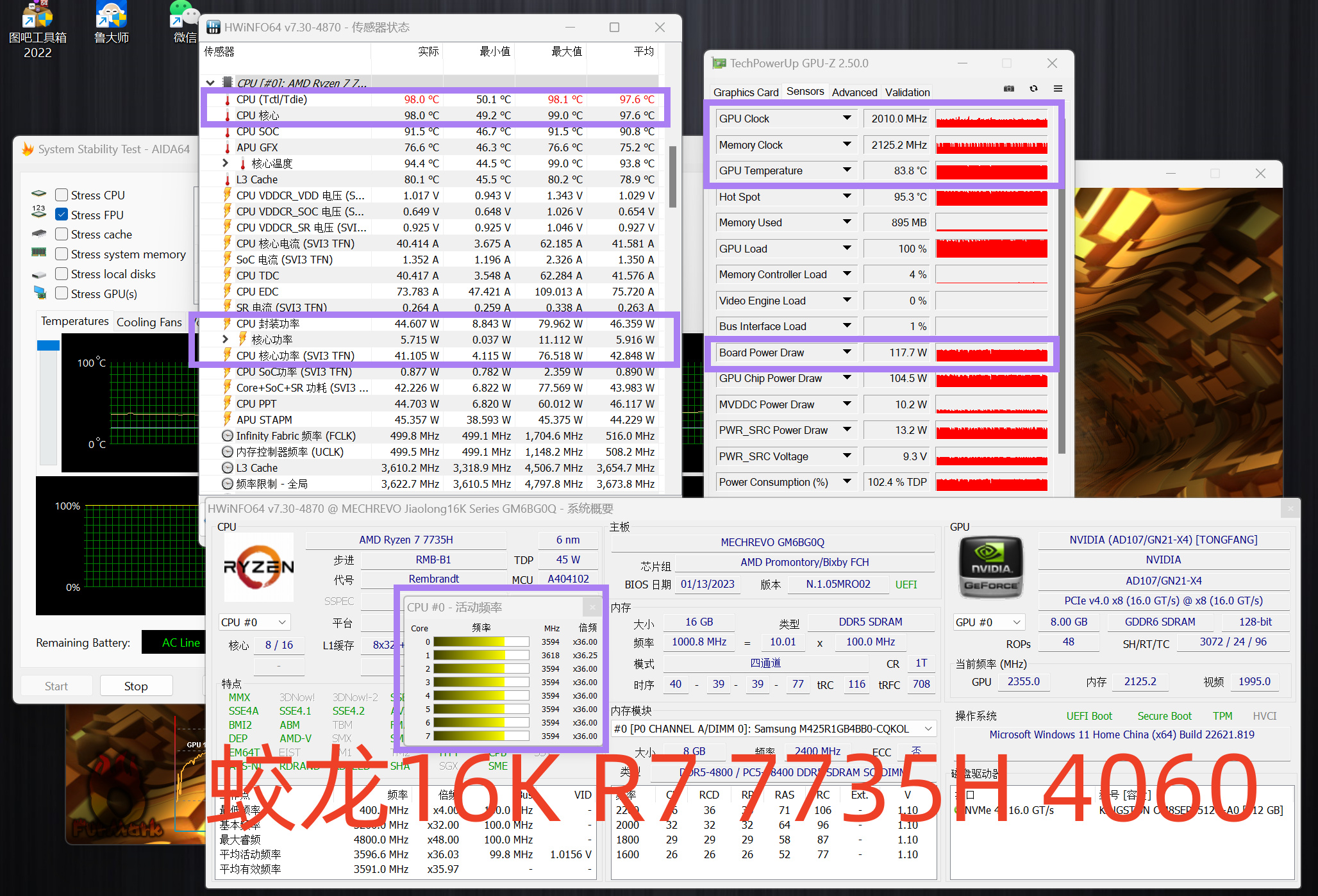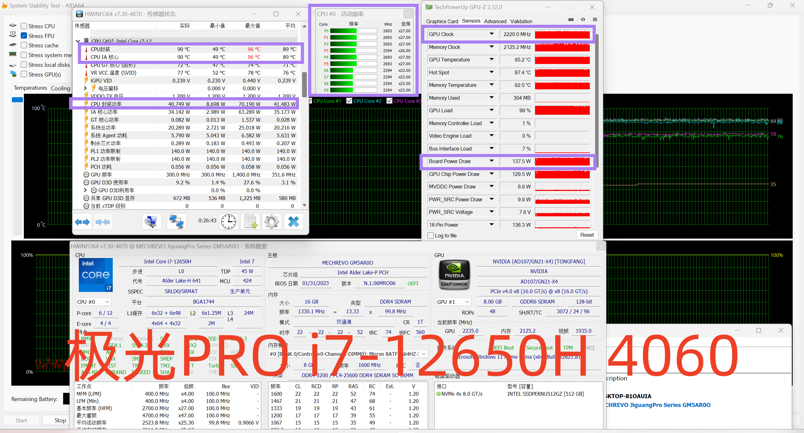 雙烤時,極光PRO的CPU溫度更低,低了8度左右。CPU在40.7W,P核2.69G,E核2.29 溫度90度,顯卡在137W,GPU核心頻率2.2GHz,溫度85.2度左右