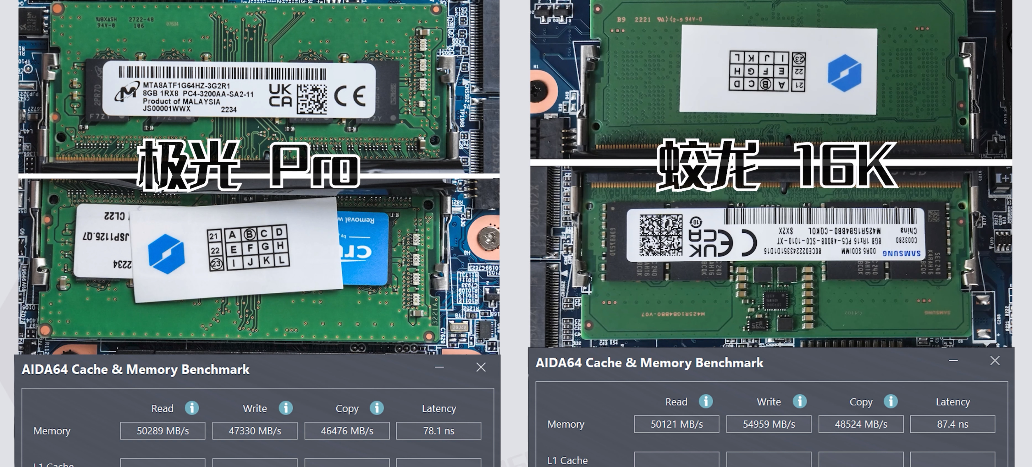 固態硬盤和內存性能更好,主要是極光PRO的QLC顆粒 INTEL 670P太拉跨了。