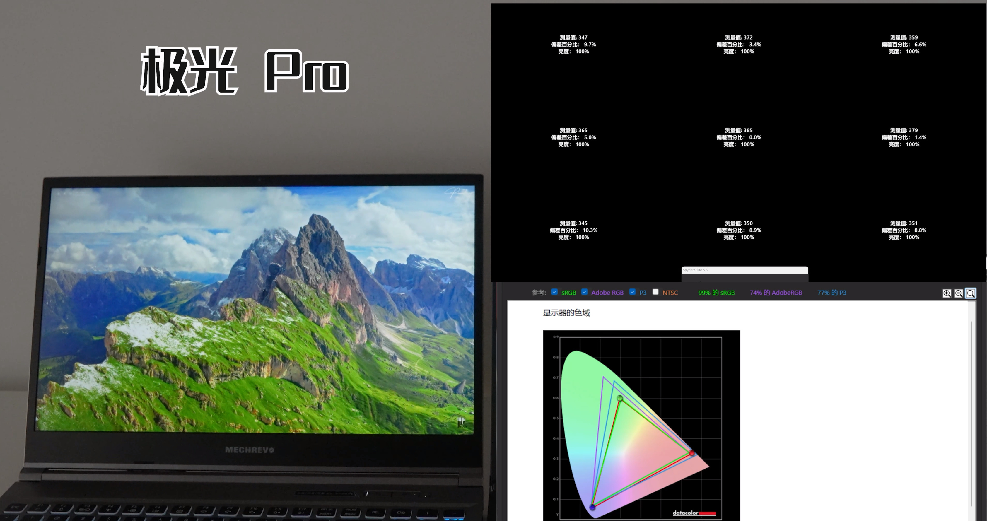 極光PRO 實測亮度最低345,最高385尼特, 實測色域99%的sRGB,