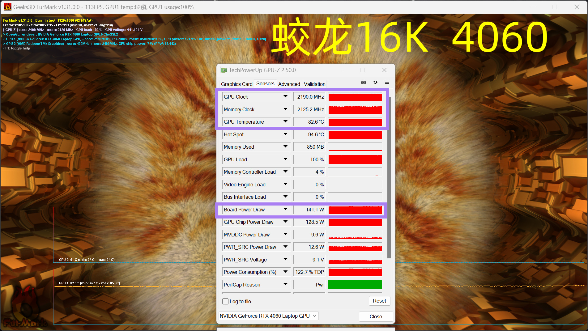 極光PRO和蛟龍16K,顯卡烤機GPU核心頻率在2.2GHz,溫度在82.7左右