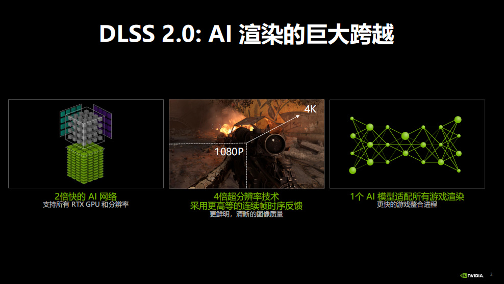 NVIDIA DLSS 2,藉助AI改善遊戲,由Tensor Cores驅動的DLSS2基於新的改進版深度學習神經網絡,它能提高幀率,同時爲遊戲生成精美、清晰的圖像。