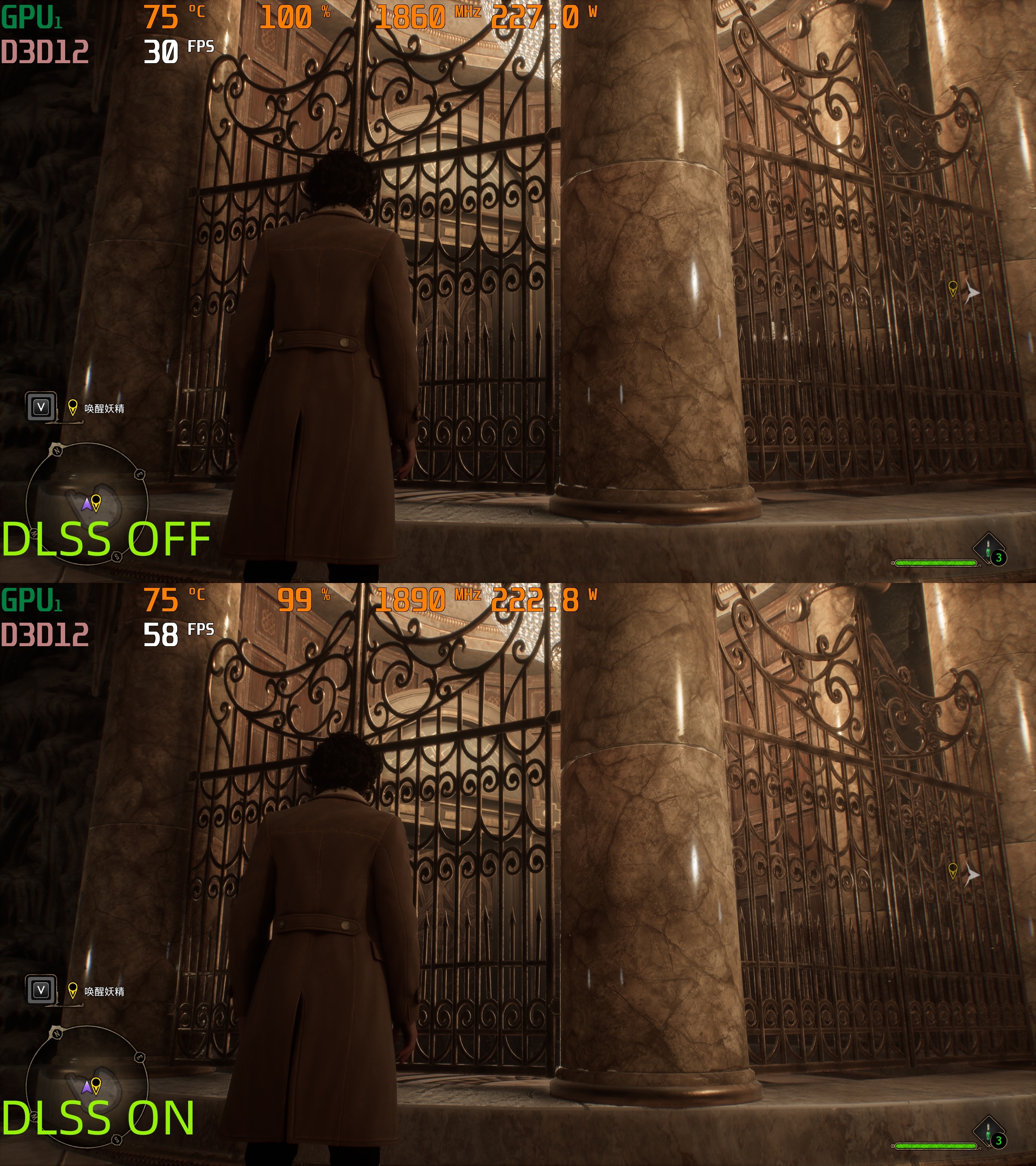 在遊戲內設置DLSS 質量時,細節處理上也還行,不特別摳細節的話,DLSS 質量模式下的遊戲畫質與原生畫質比較接近,遊戲FPS幀數最高可以達到翻倍的提升